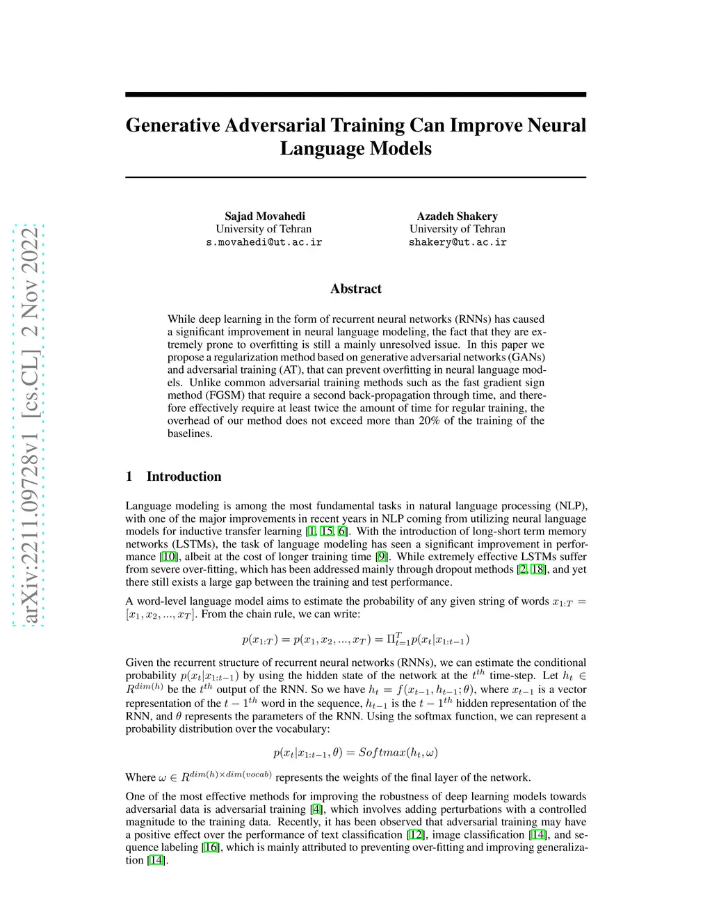 While deep learning in the form of recurrent neural networks (RNNs) has caused a significant improvement in neural language modeling, the fact that they are extremely prone to overfitting is still a mainly unresolved issue. In this paper we propose a regularization method based on generative adversarial networks (GANs) and adversarial training (AT), that can prevent overfitting in neural language models. Unlike common adversarial training methods such as the fast gradient sign method (FGSM) that require a second back-propagation through time, and therefore effectively require at least twice the amount of time for regular training, the overhead of our method does not exceed more than 20% of the training of the baselines.