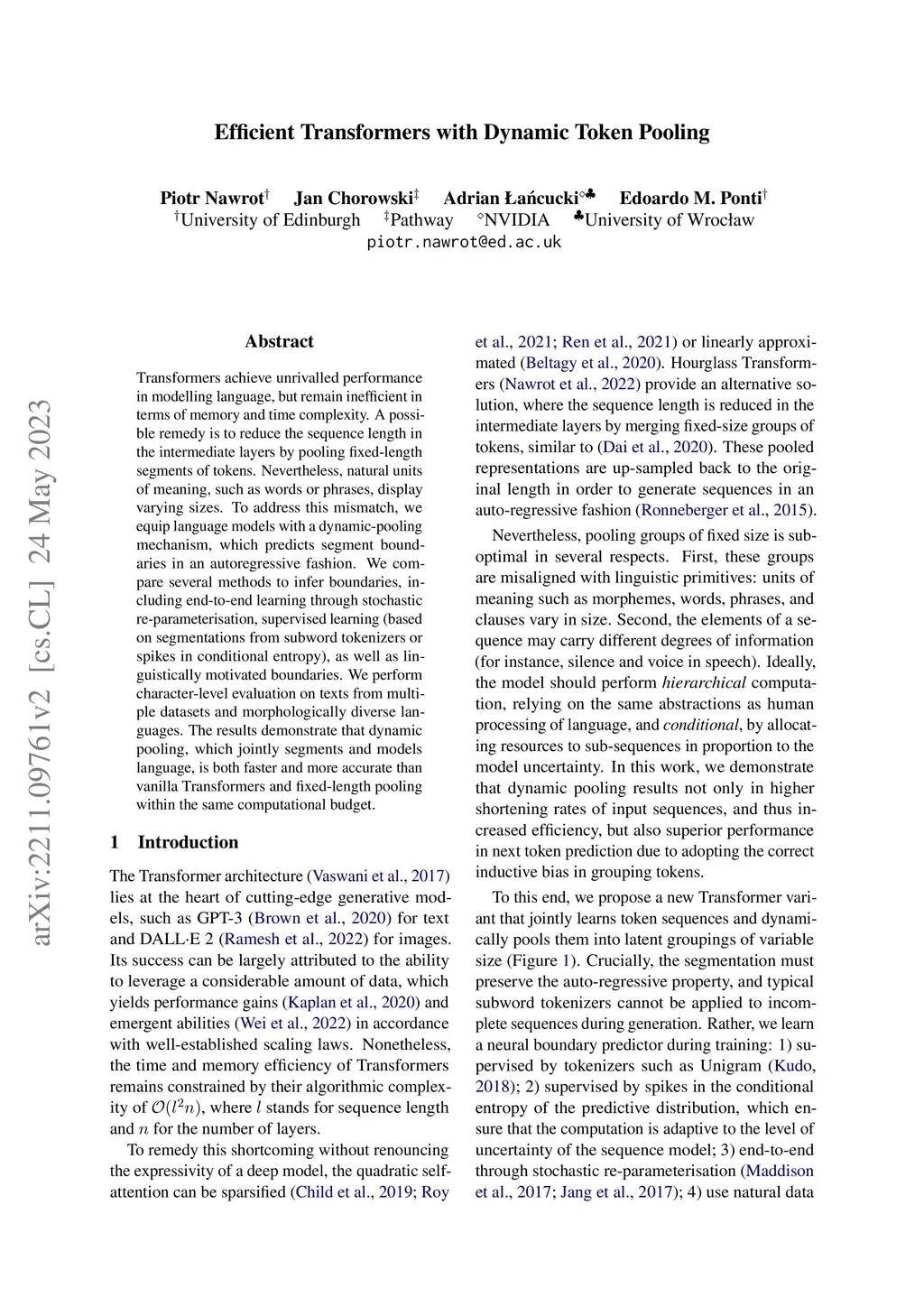 Efficient Transformers with Dynamic Token Pooling