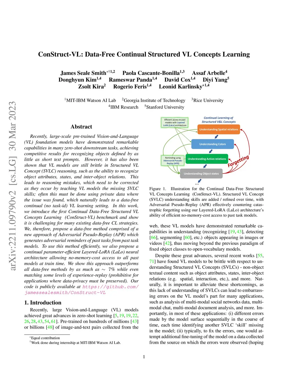 Recently, large-scale pre-trained Vision-and-Language (VL) foundation models have demonstrated remarkable capabilities in many zero-shot downstream tasks, achieving competitive results for recognizing objects defined by as little as short text prompts. However, it has also been shown that VL models are still brittle in Structured VL Concept (SVLC) reasoning, such as the ability to recognize object attributes, states, and inter-object relations. This leads to reasoning mistakes, which need to be corrected as they occur by teaching VL models the missing SVLC skills; often this must be done using private data where the issue was found, which naturally leads to a data-free continual (no task-id) VL learning setting. In this work, we introduce the first Continual Data-Free Structured VL Concepts Learning (ConStruct-VL) benchmark and show it is challenging for many existing data-free CL strategies. We, therefore, propose a data-free method comprised of a new approach of Adversarial Pseudo-Replay (APR) which generates adversarial reminders of past tasks from past task models. To use this method efficiently, we also propose a continual parameter-efficient Layered-LoRA (LaLo) neural architecture allowing no-memory-cost access to all past models at train time. We show this approach outperforms all data-free methods by as much as ~7% while even matching some levels of experience-replay (prohibitive for applications where data-privacy must be preserved). Our code is publicly available at https://github.com/jamessealesmith/ConStruct-VL