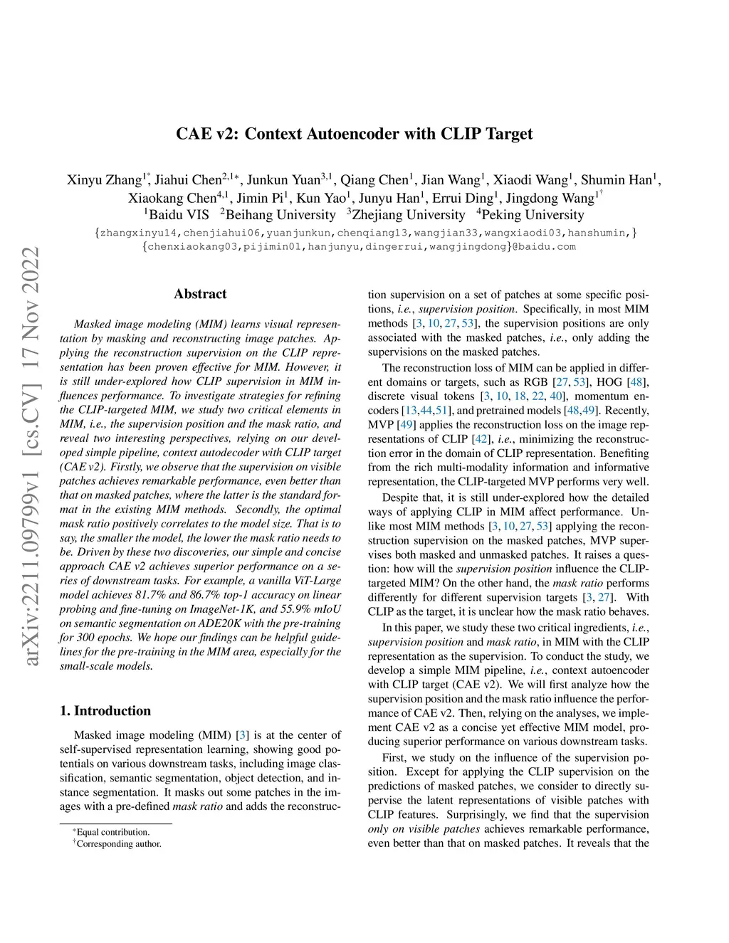 Masked image modeling (MIM) learns visual representation by masking and reconstructing image patches. Applying the reconstruction supervision on the CLIP representation has been proven effective for MIM. However, it is still under-explored how CLIP supervision in MIM influences performance. To investigate strategies for refining the CLIP-targeted MIM, we study two critical elements in MIM, i.e., the supervision position and the mask ratio, and reveal two interesting perspectives, relying on our developed simple pipeline, context autodecoder with CLIP target (CAE v2). Firstly, we observe that the supervision on visible patches achieves remarkable performance, even better than that on masked patches, where the latter is the standard format in the existing MIM methods. Secondly, the optimal mask ratio positively correlates to the model size. That is to say, the smaller the model, the lower the mask ratio needs to be. Driven by these two discoveries, our simple and concise approach CAE v2 achieves superior performance on a series of downstream tasks. For example, a vanilla ViT-Large model achieves 81.7% and 86.7% top-1 accuracy on linear probing and fine-tuning on ImageNet-1K, and 55.9% mIoU on semantic segmentation on ADE20K with the pre-training for 300 epochs. We hope our findings can be helpful guidelines for the pre-training in the MIM area, especially for the small-scale models.