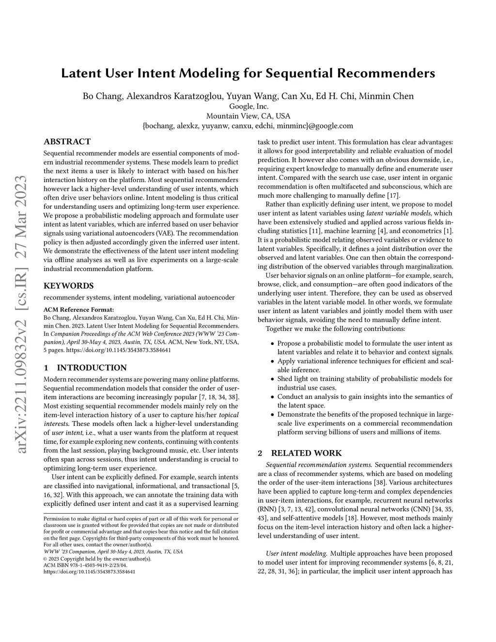 Sequential recommender models are essential components of modern industrial recommender systems. These models learn to predict the next items a user is likely to interact with based on his/her interaction history on the platform. Most sequential recommenders however lack a higher-level understanding of user intents, which often drive user behaviors online. Intent modeling is thus critical for understanding users and optimizing long-term user experience. We propose a probabilistic modeling approach and formulate user intent as latent variables, which are inferred based on user behavior signals using variational autoencoders (VAE). The recommendation policy is then adjusted accordingly given the inferred user intent. We demonstrate the effectiveness of the latent user intent modeling via offline analyses as well as live experiments on a large-scale industrial recommendation platform.
