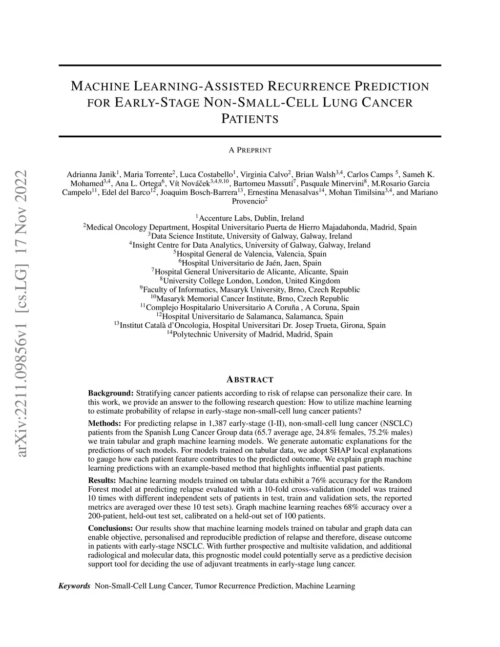 Background: Stratifying cancer patients according to risk of relapse can personalize their care. In this work, we provide an answer to the following research question: How to utilize machine learning to estimate probability of relapse in early-stage non-small-cell lung cancer patients? Methods: For predicting relapse in 1,387 early-stage (I-II), non-small-cell lung cancer (NSCLC) patients from the Spanish Lung Cancer Group data (65.7 average age, 24.8% females, 75.2% males) we train tabular and graph machine learning models. We generate automatic explanations for the predictions of such models. For models trained on tabular data, we adopt SHAP local explanations to gauge how each patient feature contributes to the predicted outcome. We explain graph machine learning predictions with an example-based method that highlights influential past patients. Results: Machine learning models trained on tabular data exhibit a 76% accuracy for the Random Forest model at predicting relapse evaluated with a 10-fold cross-validation (model was trained 10 times with different independent sets of patients in test, train and validation sets, the reported metrics are averaged over these 10 test sets). Graph machine learning reaches 68% accuracy over a 200-patient, held-out test set, calibrated on a held-out set of 100 patients. Conclusions: Our results show that machine learning models trained on tabular and graph data can enable objective, personalised and reproducible prediction of relapse and therefore, disease outcome in patients with early-stage NSCLC. With further prospective and multisite validation, and additional radiological and molecular data, this prognostic model could potentially serve as a predictive decision support tool for deciding the use of adjuvant treatments in early-stage lung cancer. Keywords: Non-Small-Cell Lung Cancer, Tumor Recurrence Prediction, Machine Learning