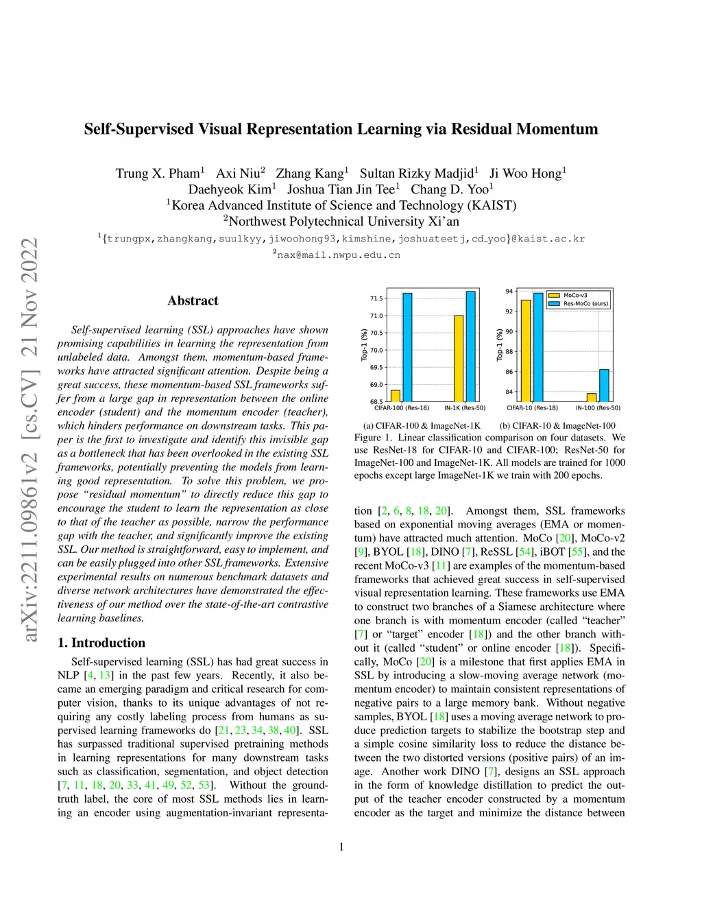Self-supervised learning (SSL) approaches have shown promising capabilities in learning the representation from unlabeled data. Amongst them, momentum-based frameworks have attracted significant attention. Despite being a great success, these momentum-based SSL frameworks suffer from a large gap in representation between the online encoder (student) and the momentum encoder (teacher), which hinders performance on downstream tasks. This paper is the first to investigate and identify this invisible gap as a bottleneck that has been overlooked in the existing SSL frameworks, potentially preventing the models from learning good representation. To solve this problem, we propose "residual momentum" to directly reduce this gap to encourage the student to learn the representation as close to that of the teacher as possible, narrow the performance gap with the teacher, and significantly improve the existing SSL. Our method is straightforward, easy to implement, and can be easily plugged into other SSL frameworks. Extensive experimental results on numerous benchmark datasets and diverse network architectures have demonstrated the effectiveness of our method over the state-of-the-art contrastive learning baselines.