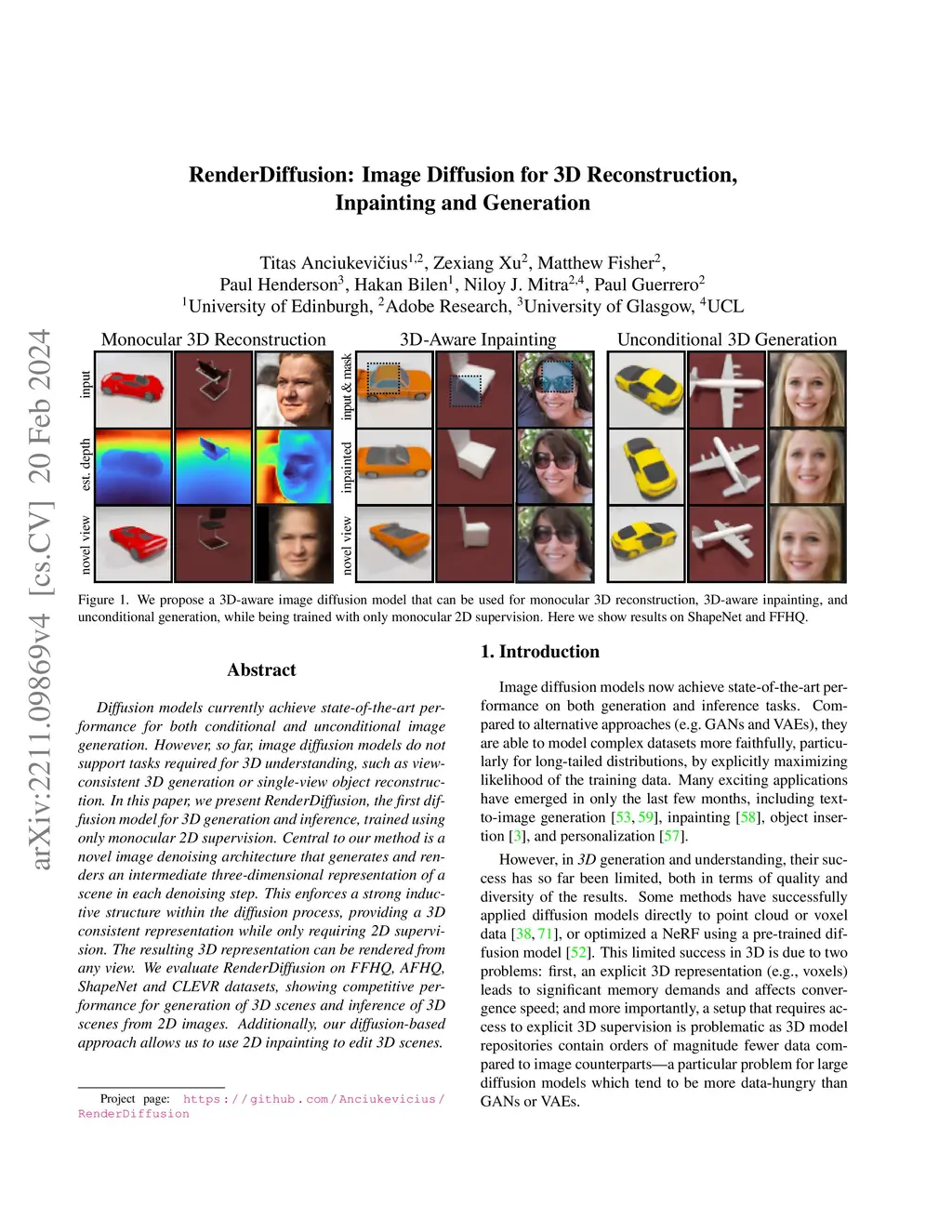 RenderDiffusion: Image Diffusion for 3D Reconstruction, Inpainting and