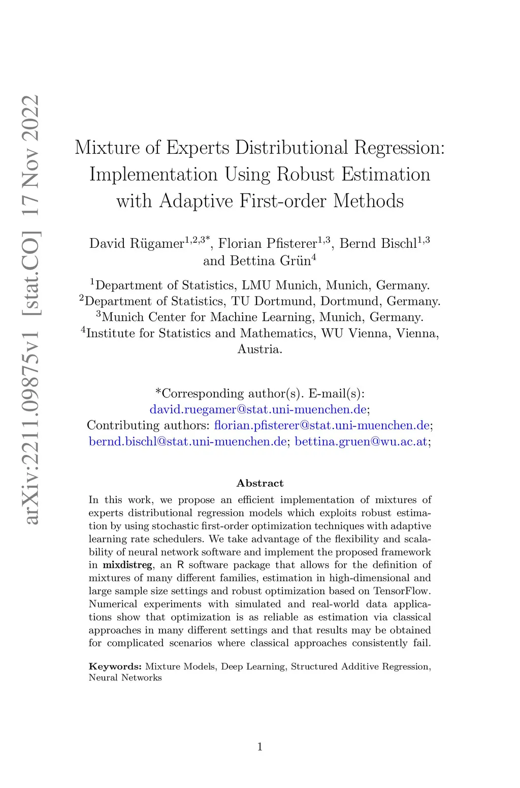 In this work, we propose an efficient implementation of mixtures of experts distributional regression models which exploits robust estimation by using stochastic first-order optimization techniques with adaptive learning rate schedulers. We take advantage of the flexibility and scalability of neural network software and implement the proposed framework in mixdistreg, an R software package that allows for the definition of mixtures of many different families, estimation in high-dimensional and large sample size settings and robust optimization based on TensorFlow. Numerical experiments with simulated and real-world data applications show that optimization is as reliable as estimation via classical approaches in many different settings and that results may be obtained for complicated scenarios where classical approaches consistently fail.