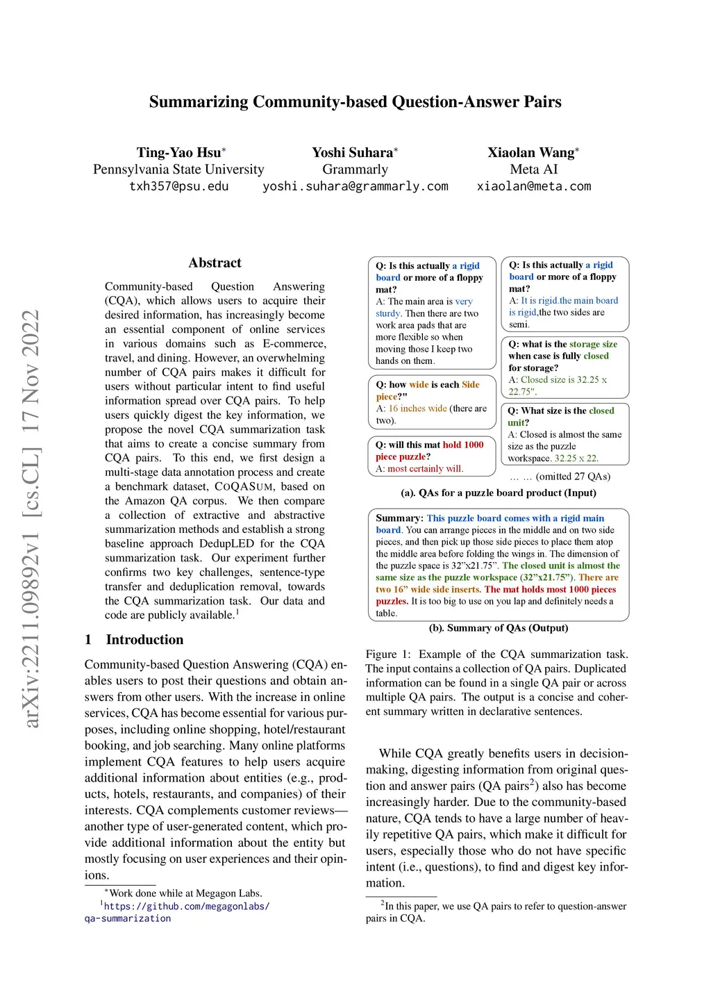 Community-based Question Answering (CQA), which allows users to acquire their desired information, has increasingly become an essential component of online services in various domains such as E-commerce, travel, and dining. However, an overwhelming number of CQA pairs makes it difficult for users without particular intent to find useful information spread over CQA pairs. To help users quickly digest the key information, we propose the novel CQA summarization task that aims to create a concise summary from CQA pairs. To this end, we first design a multi-stage data annotation process and create a benchmark dataset, CoQASUM, based on the Amazon QA corpus. We then compare a collection of extractive and abstractive summarization methods and establish a strong baseline approach DedupLED for the CQA summarization task. Our experiment further confirms two key challenges, sentence-type transfer and deduplication removal, towards the CQA summarization task. Our data and code are publicly available.