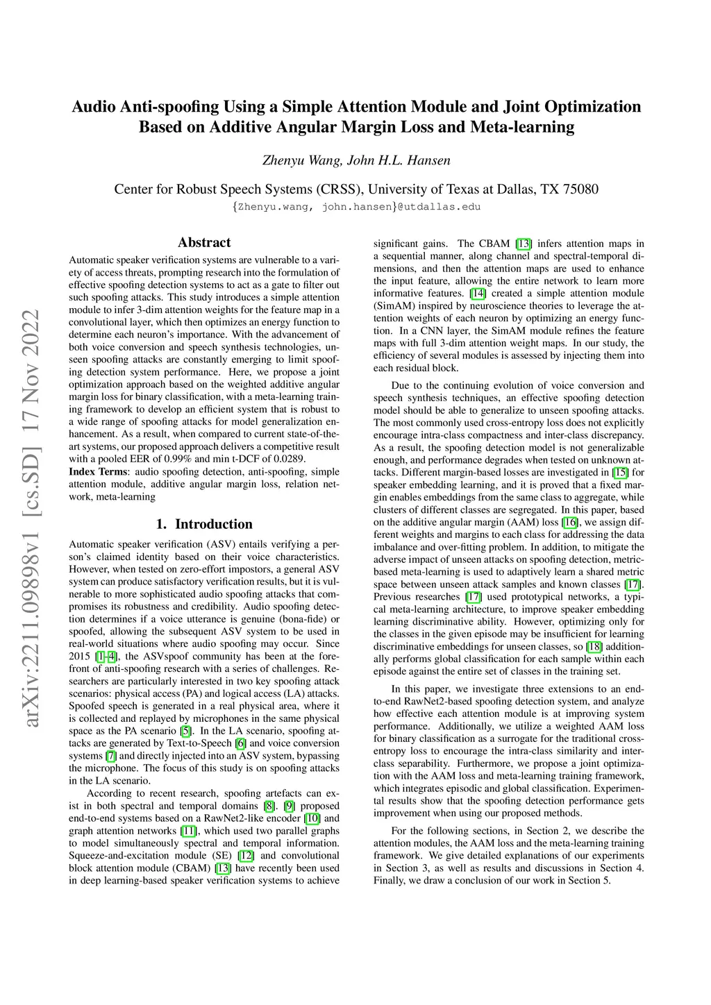 Automatic speaker verification systems are vulnerable to a variety of access threats, prompting research into the formulation of effective spoofing detection systems to act as a gate to filter out such spoofing attacks. This study introduces a simple attention module to infer 3-dim attention weights for the feature map in a convolutional layer, which then optimizes an energy function to determine each neuron's importance. With the advancement of both voice conversion and speech synthesis technologies, unseen spoofing attacks are constantly emerging to limit spoofing detection system performance. Here, we propose a joint optimization approach based on the weighted additive angular margin loss for binary classification, with a meta-learning training framework to develop an efficient system that is robust to a wide range of spoofing attacks for model generalization enhancement. As a result, when compared to current state-of-the-art systems, our proposed approach delivers a competitive result with a pooled EER of 0.99% and min t-DCF of 0.0289.