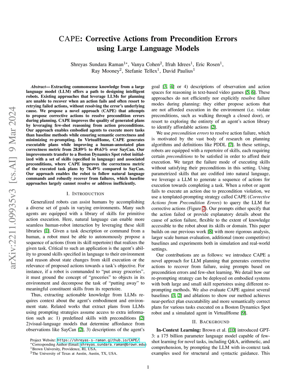 CAPE: Corrective Actions from Precondition Errors using Large Language