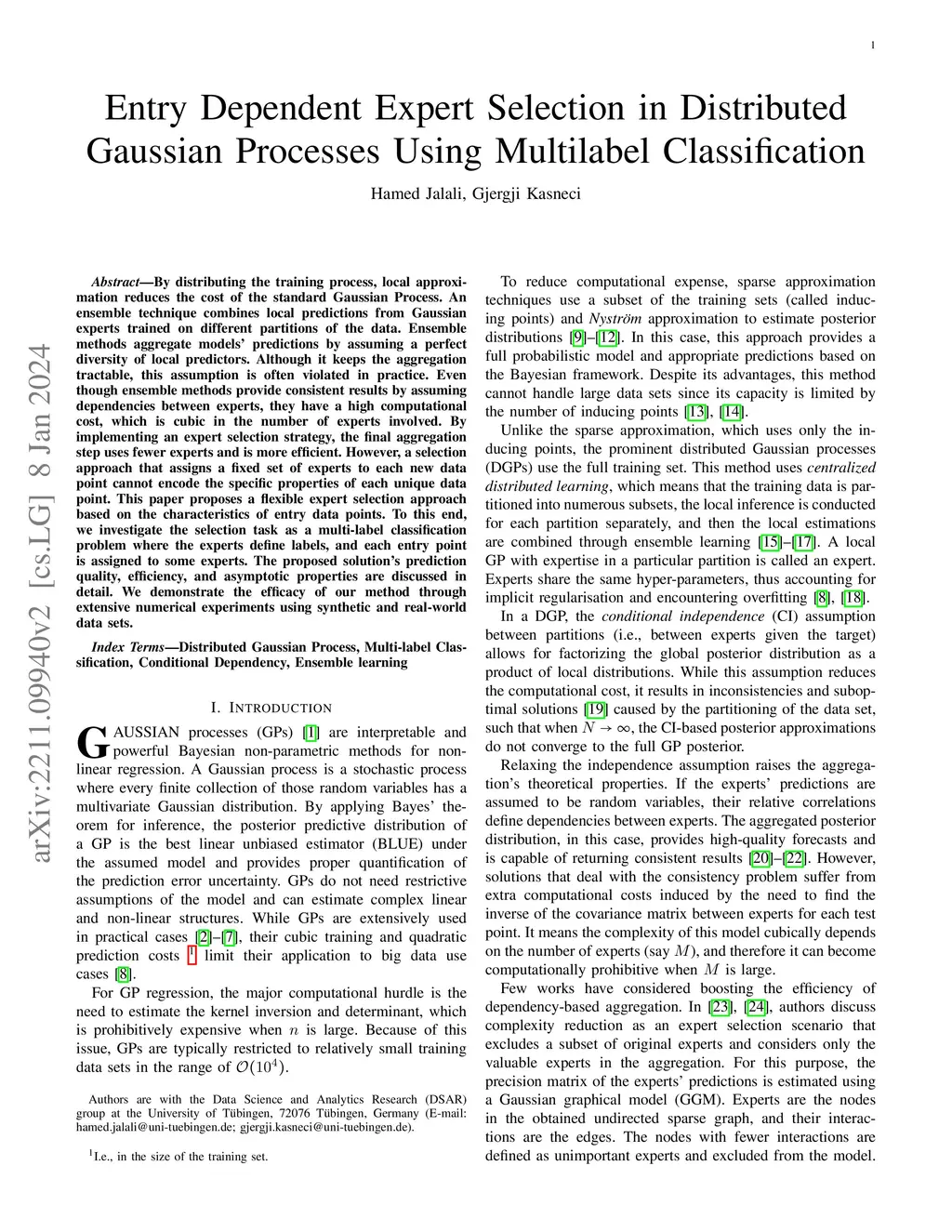 By distributing the training process, local approximation reduces the cost of the standard Gaussian Process. An ensemble technique combines local predictions from Gaussian experts trained on different partitions of the data. Ensemble methods aggregate models' predictions by assuming a perfect diversity of local predictors. Although it keeps the aggregation tractable, this assumption is often violated in practice. Even though ensemble methods provide consistent results by assuming dependencies between experts, they have a high computational cost, which is cubic in the number of experts involved. By implementing an expert selection strategy, the final aggregation step uses fewer experts and is more efficient. However, a selection approach that assigns a fixed set of experts to each new data point cannot encode the specific properties of each unique data point. This paper proposes a flexible expert selection approach based on the characteristics of entry data points. To this end, we investigate the selection task as a multi-label classification problem where the experts define labels, and each entry point is assigned to some experts. The proposed solution's prediction quality, efficiency, and asymptotic properties are discussed in detail. We demonstrate the efficacy of our method through extensive numerical experiments using synthetic and real-world data sets.