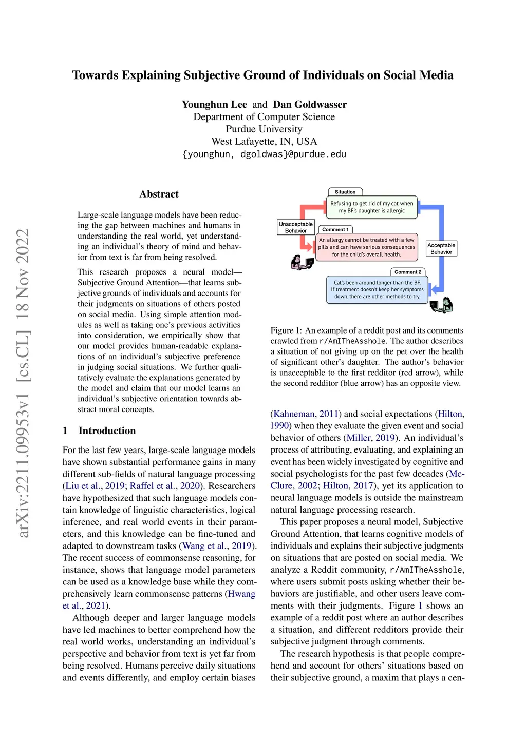 Large-scale language models have been reducing the gap between machines and humans in understanding the real world, yet understanding an individual's theory of mind and behavior from text is far from being resolved. This research proposes a neural model -- Subjective Ground Attention -- that learns subjective grounds of individuals and accounts for their judgments on situations of others posted on social media. Using simple attention modules as well as taking one's previous activities into consideration, we empirically show that our model provides human-readable explanations of an individual's subjective preference in judging social situations. We further qualitatively evaluate the explanations generated by the model and claim that our model learns an individual's subjective orientation towards abstract moral concepts
