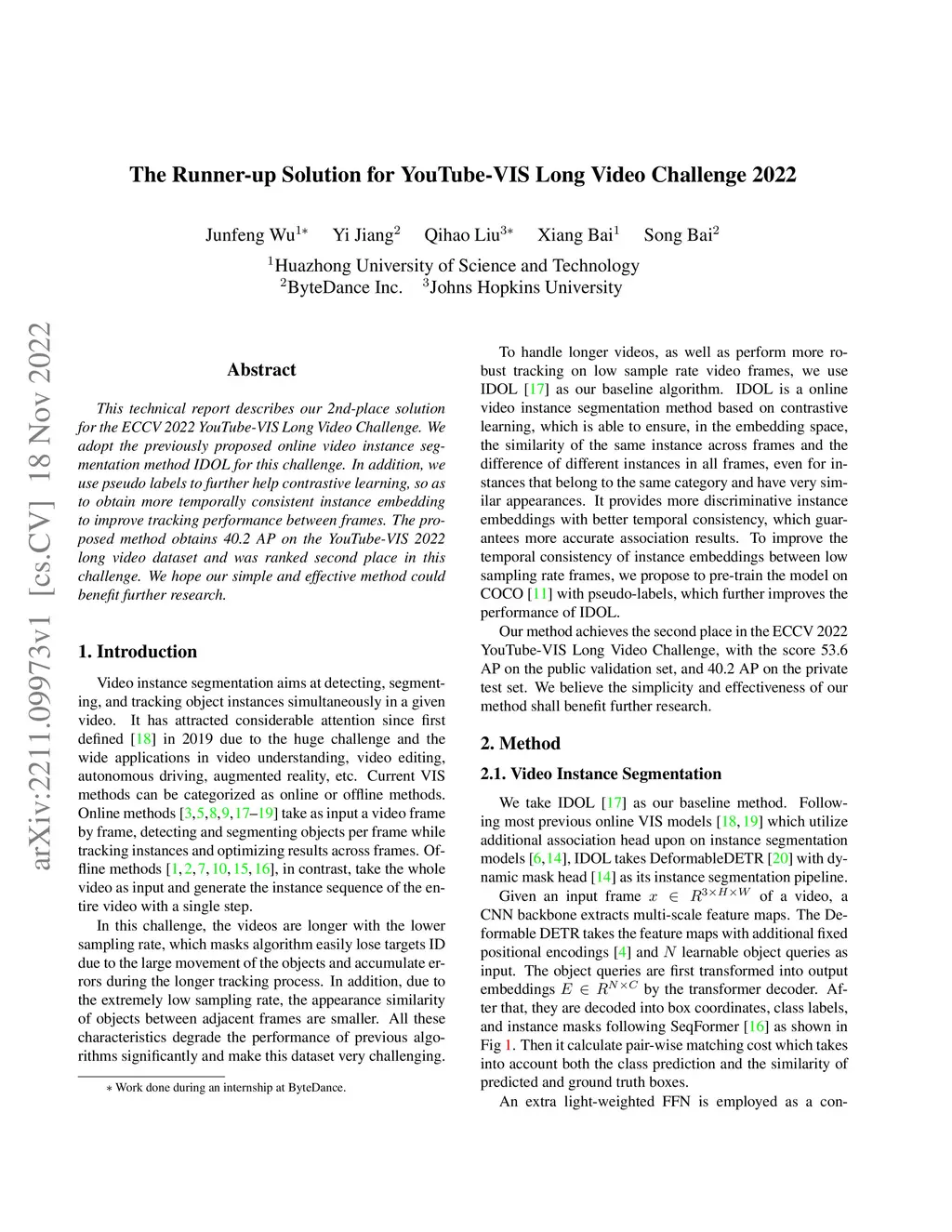 This technical report describes our 2nd-place solution for the ECCV 2022 YouTube-VIS Long Video Challenge. We adopt the previously proposed online video instance segmentation method IDOL for this challenge. In addition, we use pseudo labels to further help contrastive learning, so as to obtain more temporally consistent instance embedding to improve tracking performance between frames. The proposed method obtains 40.2 AP on the YouTube-VIS 2022 long video dataset and was ranked second place in this challenge. We hope our simple and effective method could benefit further research.