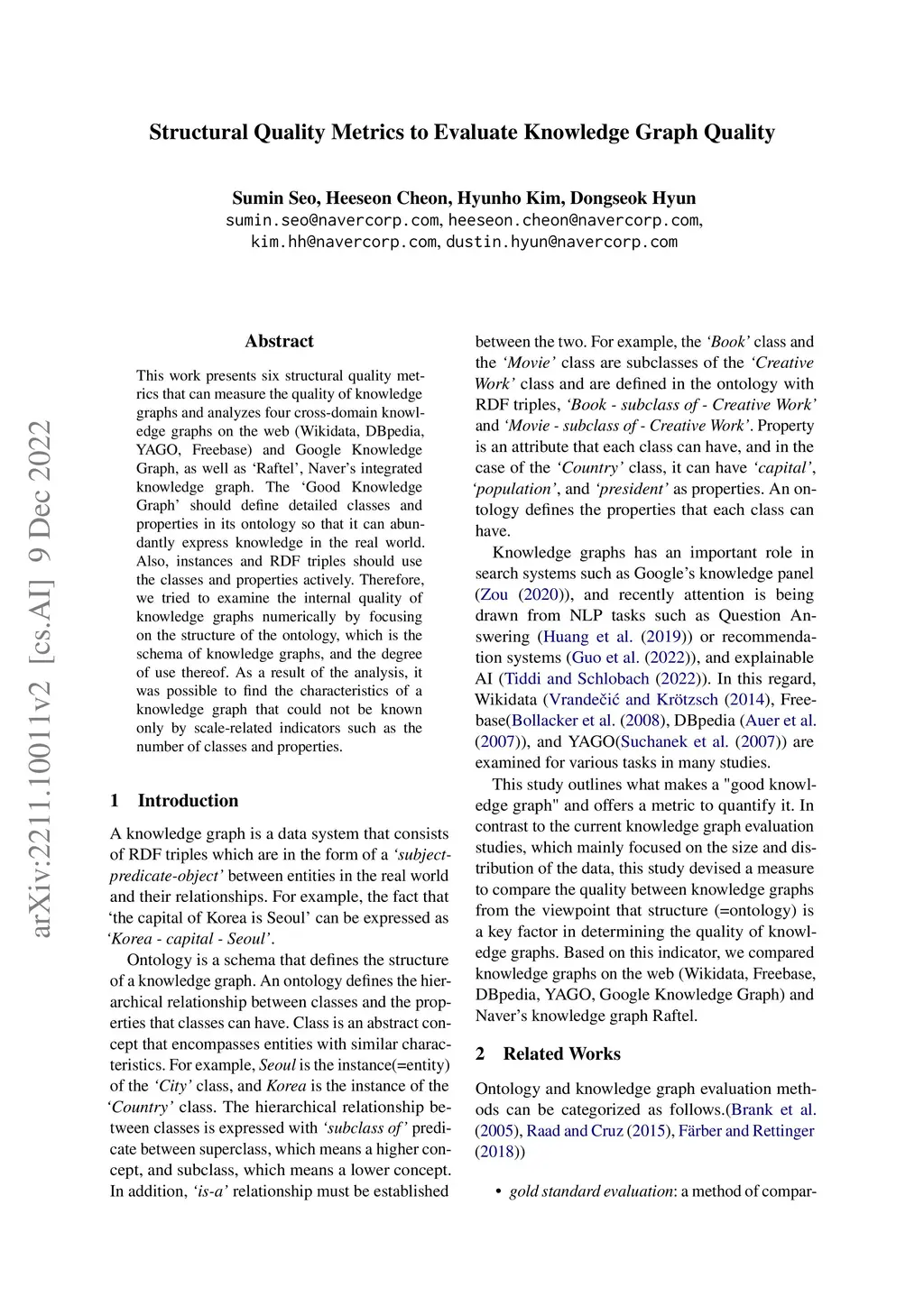 This work presents six structural quality metrics that can measure the quality of knowledge graphs and analyzes five cross-domain knowledge graphs on the web (Wikidata, DBpedia, YAGO, Google Knowledge Graph, Freebase) as well as 'Raftel', Naver's integrated knowledge graph. The 'Good Knowledge Graph' should define detailed classes and properties in its ontology so that knowledge in the real world can be expressed abundantly. Also, instances and RDF triples should use the classes and properties actively. Therefore, we tried to examine the internal quality of knowledge graphs numerically by focusing on the structure of the ontology, which is the schema of knowledge graphs, and the degree of use thereof. As a result of the analysis, it was possible to find the characteristics of a knowledge graph that could not be known only by scale-related indicators such as the number of classes and properties.
