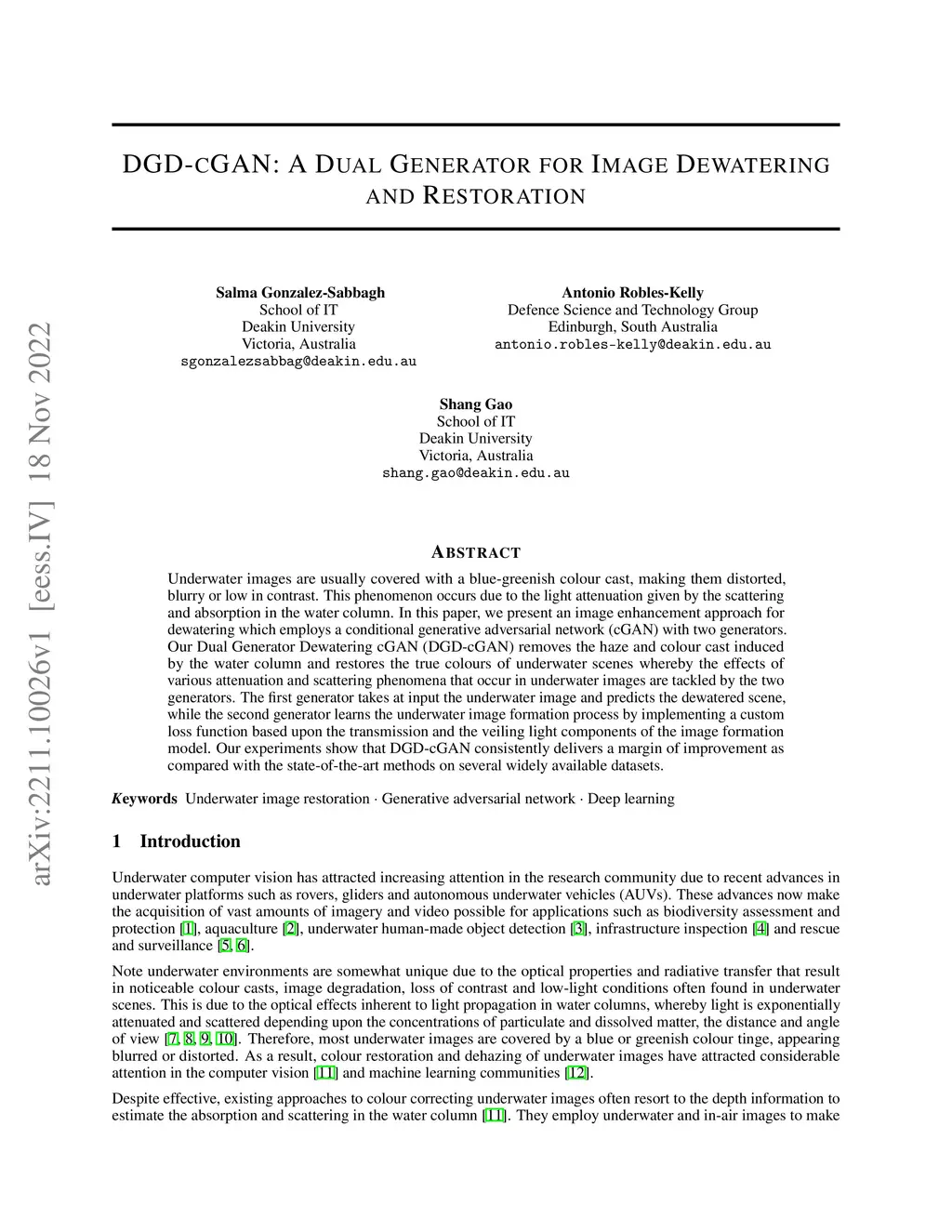 DGD-cGAN: A Dual Generator for Image Dewatering and Restoration
