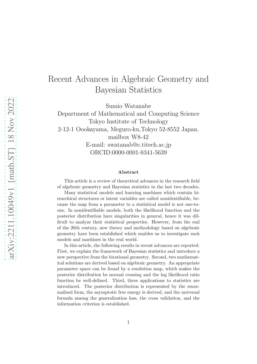 This article is a review of theoretical advances in the research field of algebraic geometry and Bayesian statistics in the last two decades. Many statistical models and learning machines which contain hierarchical structures or latent variables are called nonidentifiable, because the map from a parameter to a statistical model is not one-to-one. In nonidentifiable models, both the likelihood function and the posterior distribution have singularities in general, hence it was difficult to analyze their statistical properties. However, from the end of the 20th century, new theory and methodology based on algebraic geometry have been established which enables us to investigate such models and machines in the real world. In this article, the following results in recent advances are reported. First, we explain the framework of Bayesian statistics and introduce a new perspective from the birational geometry. Second, two mathematical solutions are derived based on algebraic geometry. An appropriate parameter space can be found by a resolution map, which makes the posterior distribution be normal crossing and the log likelihood ratio function be well-defined. Third, three applications to statistics are introduced. The posterior distribution is represented by the renormalized form, the asymptotic free energy is derived, and the universal formula among the generalization loss, the cross validation, and the information criterion is established. Two mathematical solutions and three applications to statistics based on algebraic geometry reported in this article are now being used in many practical fields in data science and artificial intelligence.