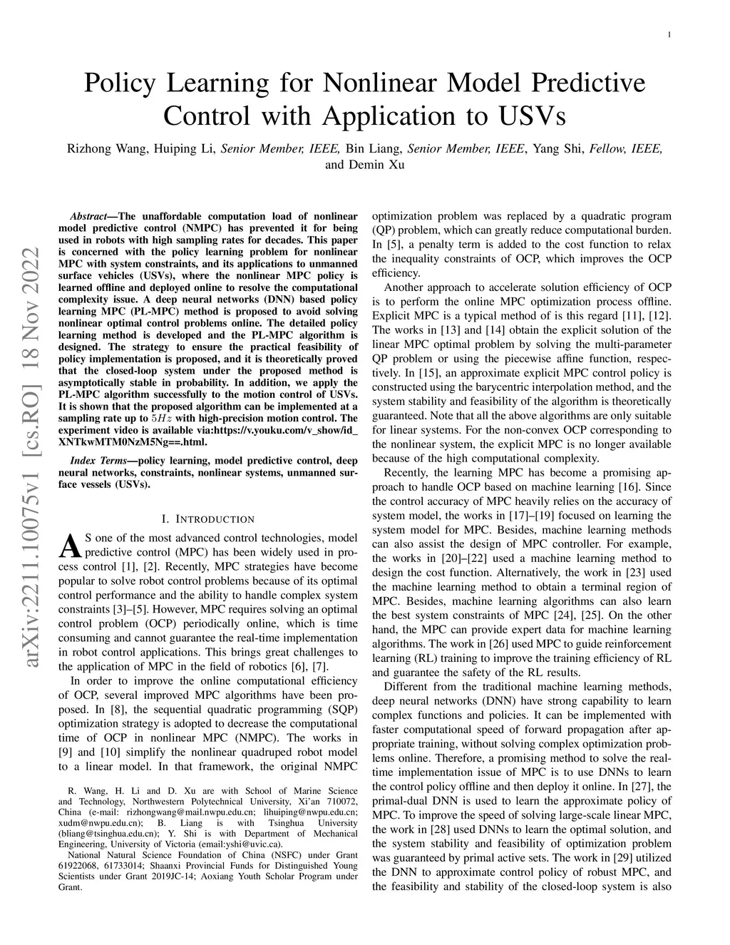 The unaffordable computation load of nonlinear model predictive control (NMPC) has prevented it for being used in robots with high sampling rates for decades. This paper is concerned with the policy learning problem for nonlinear MPC with system constraints, and its applications to unmanned surface vehicles (USVs), where the nonlinear MPC policy is learned offline and deployed online to resolve the computational complexity issue. A deep neural networks (DNN) based policy learning MPC (PL-MPC) method is proposed to avoid solving nonlinear optimal control problems online. The detailed policy learning method is developed and the PL-MPC algorithm is designed. The strategy to ensure the practical feasibility of policy implementation is proposed, and it is theoretically proved that the closed-loop system under the proposed method is asymptotically stable in probability. In addition, we apply the PL-MPC algorithm successfully to the motion control of USVs. It is shown that the proposed algorithm can be implemented at a sampling rate up to with high-precision motion control. The experiment video is available via:\url{https://v.youku.com/v_show/id_XNTkwMTM0NzM5Ng==.html
