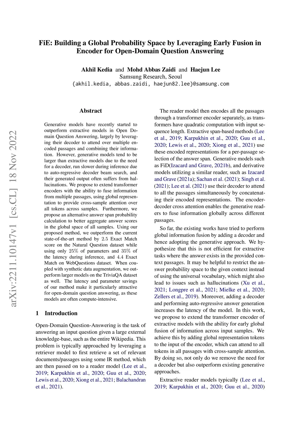 Generative models have recently started to outperform extractive models in Open Domain Question Answering, largely by leveraging their decoder to attend over multiple encoded passages and combining their information. However, generative models tend to be larger than extractive models due to the need for a decoder, run slower during inference due to auto-regressive decoder beam search, and their generated output often suffers from hallucinations. We propose to extend transformer encoders with the ability to fuse information from multiple passages, using global representation to provide cross-sample attention over all tokens across samples. Furthermore, we propose an alternative answer span probability calculation to better aggregate answer scores in the global space of all samples. Using our proposed method, we outperform the current state-of-the-art method by Exact Match score on the Natural Question dataset while using only of parameters and of the latency during inference, and Exact Match on WebQuestions dataset. When coupled with synthetic data augmentation, we outperform larger models on the TriviaQA dataset as well. The latency and parameter savings of our method make it particularly attractive for open-domain question answering, as these models are often compute-intensive.