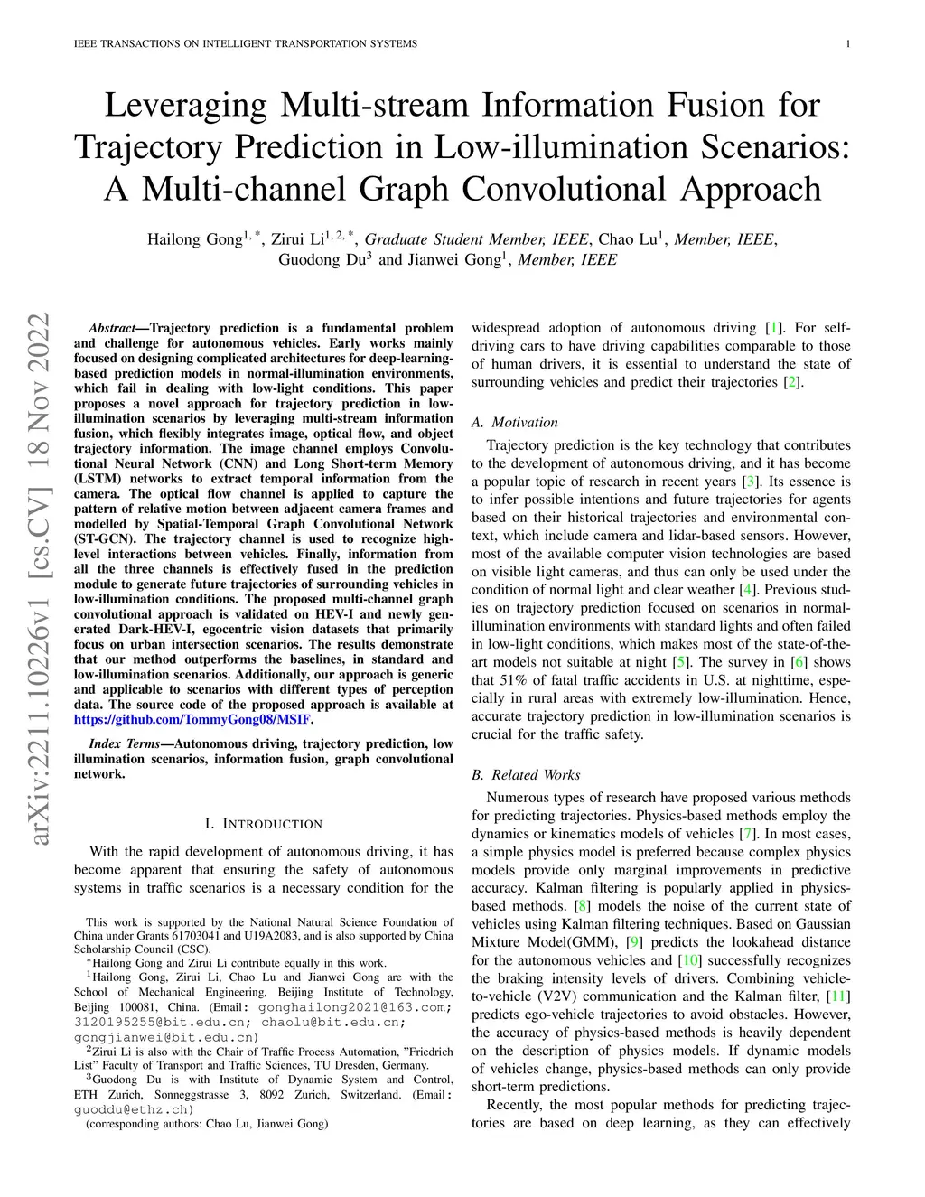 Trajectory prediction is a fundamental problem and challenge for autonomous vehicles. Early works mainly focused on designing complicated architectures for deep-learning-based prediction models in normal-illumination environments, which fail in dealing with low-light conditions. This paper proposes a novel approach for trajectory prediction in low-illumination scenarios by leveraging multi-stream information fusion, which flexibly integrates image, optical flow, and object trajectory information. The image channel employs Convolutional Neural Network (CNN) and Long Short-term Memory (LSTM) networks to extract temporal information from the camera. The optical flow channel is applied to capture the pattern of relative motion between adjacent camera frames and modelled by Spatial-Temporal Graph Convolutional Network (ST-GCN). The trajectory channel is used to recognize high-level interactions between vehicles. Finally, information from all the three channels is effectively fused in the prediction module to generate future trajectories of surrounding vehicles in low-illumination conditions. The proposed multi-channel graph convolutional approach is validated on HEV-I and newly generated Dark-HEV-I, egocentric vision datasets that primarily focus on urban intersection scenarios. The results demonstrate that our method outperforms the baselines, in standard and low-illumination scenarios. Additionally, our approach is generic and applicable to scenarios with different types of perception data. The source code of the proposed approach is available at https://github.com/TommyGong08/MSIF}{https://github.com/TommyGong08/MSIF.