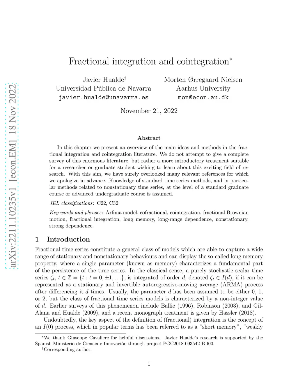 In this chapter we present an overview of the main ideas and methods in the fractional integration and cointegration literature. We do not attempt to give a complete survey of this enormous literature, but rather a more introductory treatment suitable for a researcher or graduate student wishing to learn about this exciting field of research. With this aim, we have surely overlooked many relevant references for which we apologize in advance. Knowledge of standard time series methods, and in particular methods related to nonstationary time series, at the level of a standard graduate course or advanced undergraduate course is assumed.