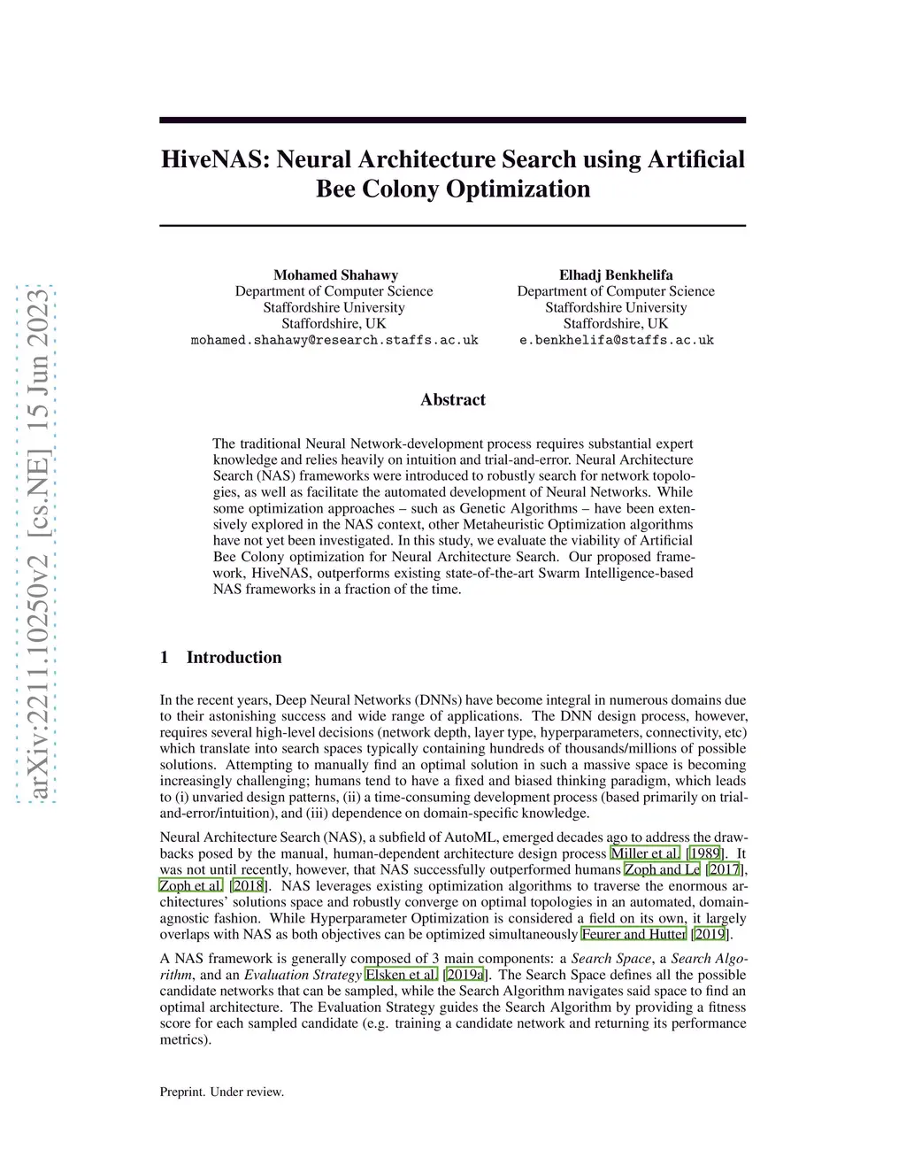 HiveNAS: Neural Architecture Search using Artificial Bee Colony