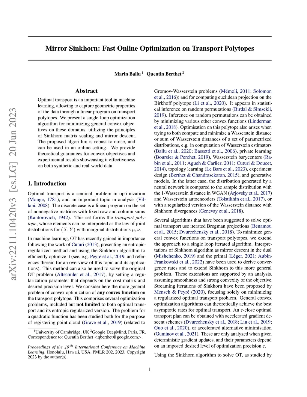 Optimal transport is an important tool in machine learning, allowing to capture geometric properties of the data through a linear program on transport polytopes. We present a single-loop optimization algorithm for minimizing general convex objectives on these domains, utilizing the principles of Sinkhorn matrix scaling and mirror descent. The proposed algorithm is robust to noise, and can be used in an online setting. We provide theoretical guarantees for convex objectives and experimental results showcasing it effectiveness on both synthetic and real-world data.
