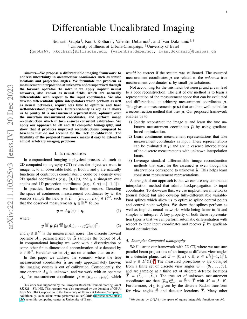 We propose a differentiable imaging framework to address uncertainty in measurement coordinates such as sensor locations and projection angles. We formulate the problem as measurement interpolation at unknown nodes supervised through the forward operator. To solve it we apply implicit neural networks, also known as neural fields, which are naturally differentiable with respect to the input coordinates. We also develop differentiable spline interpolators which perform as well as neural networks, require less time to optimize and have well-understood properties. Differentiability is key as it allows us to jointly fit a measurement representation, optimize over the uncertain measurement coordinates, and perform image reconstruction which in turn ensures consistent calibration. We apply our approach to 2D and 3D computed tomography, and show that it produces improved reconstructions compared to baselines that do not account for the lack of calibration. The flexibility of the proposed framework makes it easy to extend to almost arbitrary imaging problems.