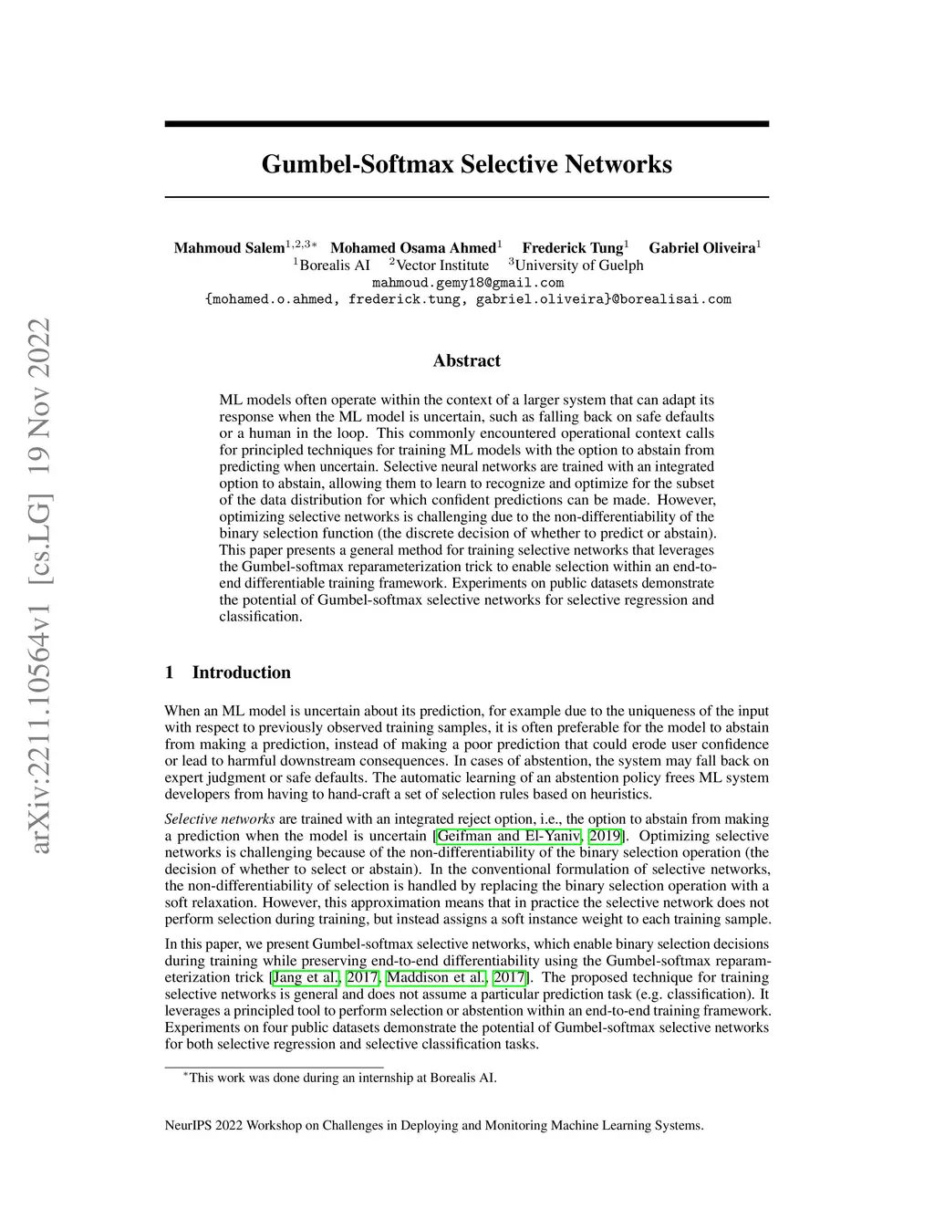 ML models often operate within the context of a larger system that can adapt its response when the ML model is uncertain, such as falling back on safe defaults or a human in the loop. This commonly encountered operational context calls for principled techniques for training ML models with the option to abstain from predicting when uncertain. Selective neural networks are trained with an integrated option to abstain, allowing them to learn to recognize and optimize for the subset of the data distribution for which confident predictions can be made. However, optimizing selective networks is challenging due to the non-differentiability of the binary selection function (the discrete decision of whether to predict or abstain). This paper presents a general method for training selective networks that leverages the Gumbel-softmax reparameterization trick to enable selection within an end-to-end differentiable training framework. Experiments on public datasets demonstrate the potential of Gumbel-softmax selective networks for selective regression and classification.
