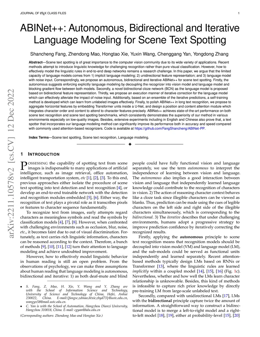 Scene text spotting is of great importance to the computer vision community due to its wide variety of applications. Recent methods attempt to introduce linguistic knowledge for challenging recognition rather than pure visual classification. However, how to effectively model the linguistic rules in end-to-end deep networks remains a research challenge. In this paper, we argue that the limited capacity of language models comes from 1) implicit language modeling; 2) unidirectional feature representation; and 3) language model with noise input. Correspondingly, we propose an autonomous, bidirectional and iterative ABINet++ for scene text spotting. Firstly, the autonomous suggests enforcing explicitly language modeling by decoupling the recognizer into vision model and language model and blocking gradient flow between both models. Secondly, a novel bidirectional cloze network (BCN) as the language model is proposed based on bidirectional feature representation. Thirdly, we propose an execution manner of iterative correction for the language model which can effectively alleviate the impact of noise input. Finally, to polish ABINet++ in long text recognition, we propose to aggregate horizontal features by embedding Transformer units inside a U-Net, and design a position and content attention module which integrates character order and content to attend to character features precisely. ABINet++ achieves state-of-the-art performance on both scene text recognition and scene text spotting benchmarks, which consistently demonstrates the superiority of our method in various environments especially on low-quality images. Besides, extensive experiments including in English and Chinese also prove that, a text spotter that incorporates our language modeling method can significantly improve its performance both in accuracy and speed compared with commonly used attention-based recognizers.