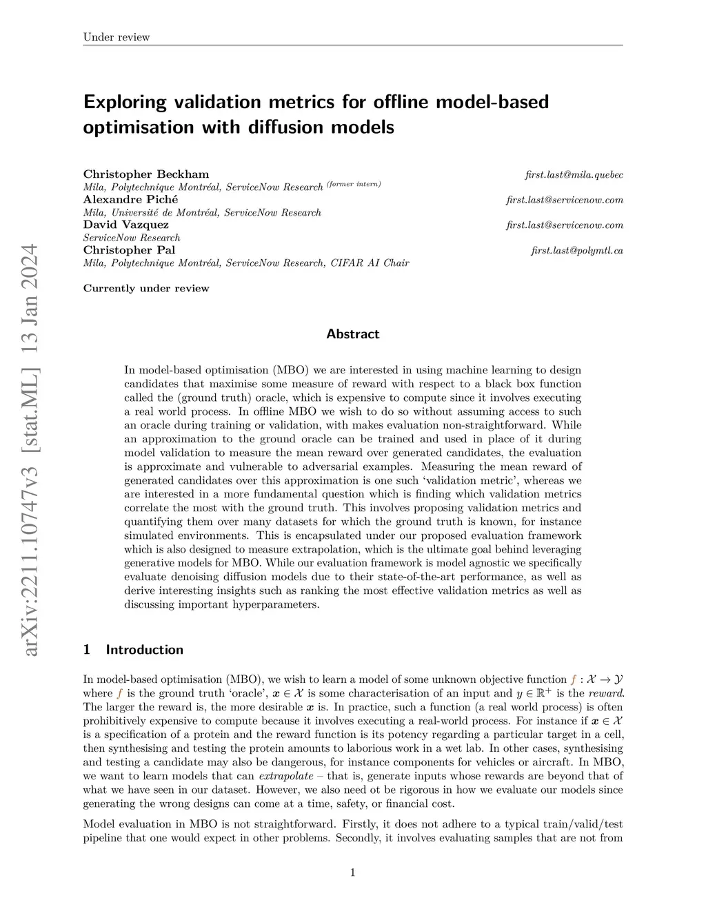 In model-based optimisation (MBO) we are interested in using machine learning to design candidates that maximise some measure of reward with respect to a black box function called the (ground truth) oracle, which is expensive to compute since it involves executing a real world process. In offline MBO we wish to do so without assuming access to such an oracle during training or validation, with makes evaluation non-straightforward. While an approximation to the ground oracle can be trained and used in place of it during model validation to measure the mean reward over generated candidates, the evaluation is approximate and vulnerable to adversarial examples. Measuring the mean reward of generated candidates over this approximation is one such `validation metric', whereas we are interested in a more fundamental question which is finding which validation metrics correlate the most with the ground truth. This involves proposing validation metrics and quantifying them over many datasets for which the ground truth is known, for instance simulated environments. This is encapsulated under our proposed evaluation framework which is also designed to measure extrapolation, which is the ultimate goal behind leveraging generative models for MBO. While our evaluation framework is model agnostic we specifically evaluate denoising diffusion models due to their state-of-the-art performance, as well as derive interesting insights such as ranking the most effective validation metrics as well as discussing important hyperparameters.