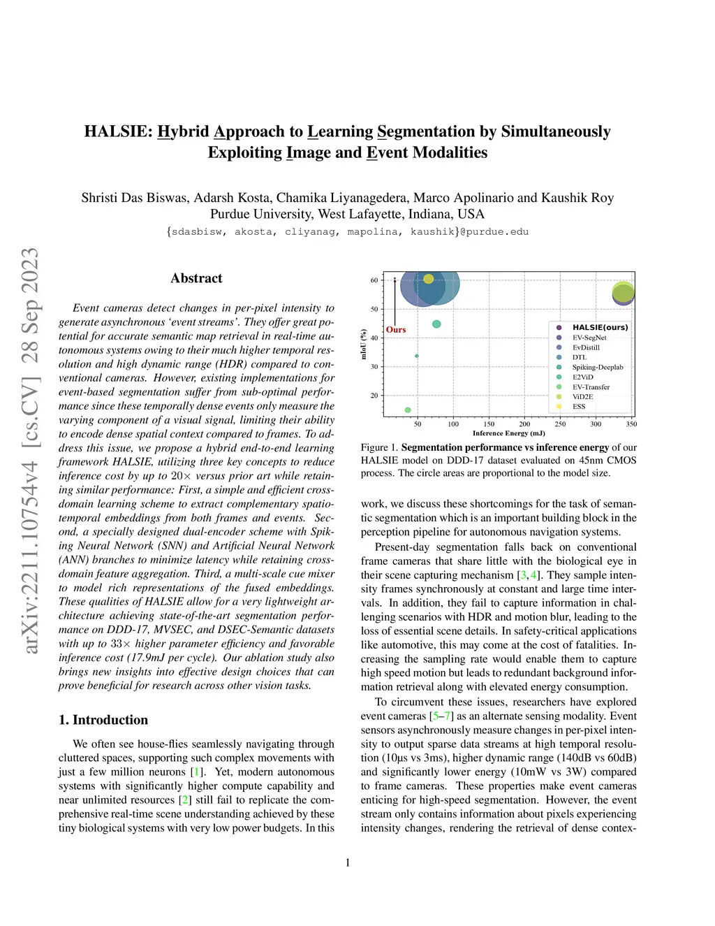 Event cameras detect changes in per-pixel intensity to generate asynchronous `event streams'. They offer great potential for accurate semantic map retrieval in real-time autonomous systems owing to their much higher temporal resolution and high dynamic range (HDR) compared to conventional cameras. However, existing implementations for event-based segmentation suffer from sub-optimal performance since these temporally dense events only measure the varying component of a visual signal, limiting their ability to encode dense spatial context compared to frames. To address this issue, we propose a hybrid end-to-end learning framework HALSIE, utilizing three key concepts to reduce inference cost by up to versus prior art while retaining similar performance: First, a simple and efficient cross-domain learning scheme to extract complementary spatio-temporal embeddings from both frames and events. Second, a specially designed dual-encoder scheme with Spiking Neural Network (SNN) and Artificial Neural Network (ANN) branches to minimize latency while retaining cross-domain feature aggregation. Third, a multi-scale cue mixer to model rich representations of the fused embeddings. These qualities of HALSIE allow for a very lightweight architecture achieving state-of-the-art segmentation performance on DDD-17, MVSEC, and DSEC-Semantic datasets with up to higher parameter efficiency and favorable inference cost (17.9mJ per cycle). Our ablation study also brings new insights into effective design choices that can prove beneficial for research across other vision tasks.