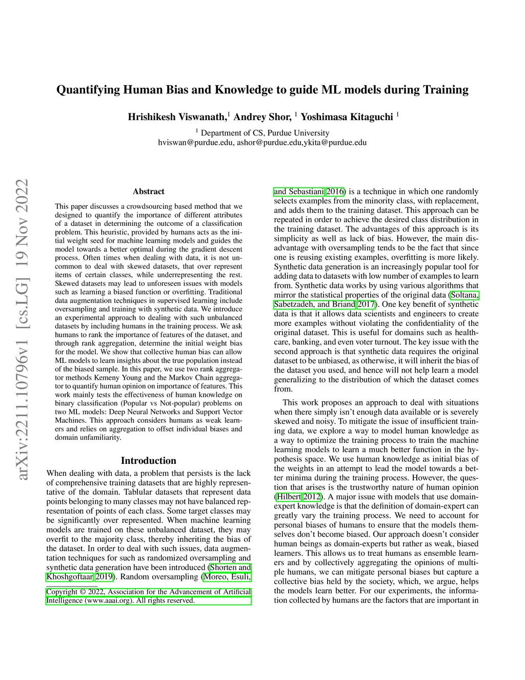 This paper discusses a crowdsourcing based method that we designed to quantify the importance of different attributes of a dataset in determining the outcome of a classification problem. This heuristic, provided by humans acts as the initial weight seed for machine learning models and guides the model towards a better optimal during the gradient descent process. Often times when dealing with data, it is not uncommon to deal with skewed datasets, that over represent items of certain classes, while underrepresenting the rest. Skewed datasets may lead to unforeseen issues with models such as learning a biased function or overfitting. Traditional data augmentation techniques in supervised learning include oversampling and training with synthetic data. We introduce an experimental approach to dealing with such unbalanced datasets by including humans in the training process. We ask humans to rank the importance of features of the dataset, and through rank aggregation, determine the initial weight bias for the model. We show that collective human bias can allow ML models to learn insights about the true population instead of the biased sample. In this paper, we use two rank aggregator methods Kemeny Young and the Markov Chain aggregator to quantify human opinion on importance of features. This work mainly tests the effectiveness of human knowledge on binary classification (Popular vs Not-popular) problems on two ML models: Deep Neural Networks and Support Vector Machines. This approach considers humans as weak learners and relies on aggregation to offset individual biases and domain unfamiliarity.