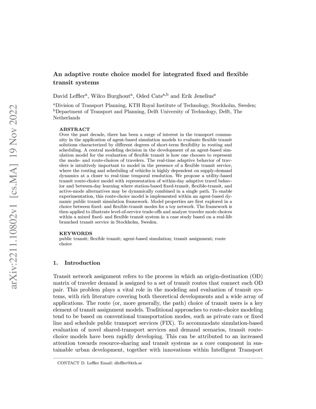 Over the past decade, there has been a surge of interest in the transport community in the application of agent-based simulation models to evaluate flexible transit solutions characterized by different degrees of short-term flexibility in routing and scheduling. A central modeling decision in the development of an agent-based simulation model for the evaluation of flexible transit is how one chooses to represent the mode- and route-choices of travelers. The real-time adaptive behavior of travelers is intuitively important to model in the presence of a flexible transit service, where the routing and scheduling of vehicles is highly dependent on supply-demand dynamics at a closer to real-time temporal resolution. We propose a utility-based transit route-choice model with representation of within-day adaptive travel behavior and between-day learning where station-based fixed-transit, flexible-transit, and active-mode alternatives may be dynamically combined in a single path. To enable experimentation, this route-choice model is implemented within an agent-based dynamic public transit simulation framework. Model properties are first explored in a choice between fixed- and flexible-transit modes for a toy network. The framework is then applied to illustrate level-of-service trade-offs and analyze traveler mode choices within a mixed fixed- and flexible transit system in a case study based on a real-life branched transit service in Stockholm, Sweden.