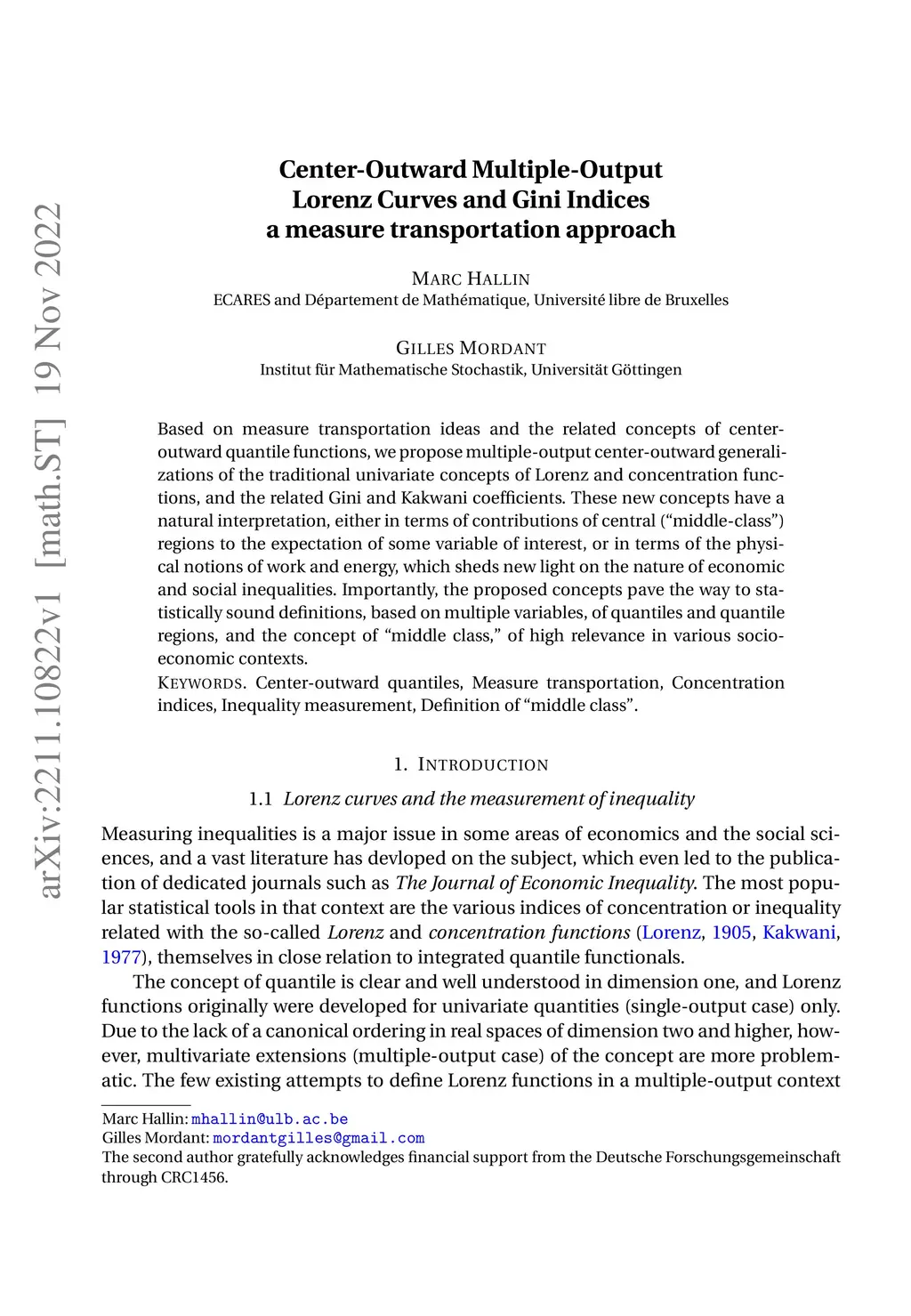Based on measure transportation ideas and the related concepts of center-outward quantile functions, we propose multiple-output center-outward generalizations of the traditional univariate concepts of Lorenz and concentration functions, and the related Gini and Kakwani coefficients. These new concepts have a natural interpretation, either in terms of contributions of central ("middle-class") regions to the expectation of some variable of interest, or in terms of the physical notions of work and energy, which sheds new light on the nature of economic and social inequalities. Importantly, the proposed concepts pave the way to statistically sound definitions, based on multiple variables, of quantiles and quantile regions, and the concept of "middle class," of high relevance in various socio-economic contexts.