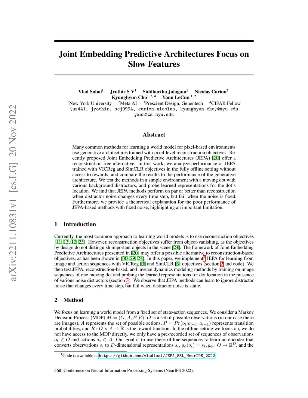 Many common methods for learning a world model for pixel-based environments use generative architectures trained with pixel-level reconstruction objectives. Recently proposed Joint Embedding Predictive Architectures (JEPA) offer a reconstruction-free alternative. In this work, we analyze performance of JEPA trained with VICReg and SimCLR objectives in the fully offline setting without access to rewards, and compare the results to the performance of the generative architecture. We test the methods in a simple environment with a moving dot with various background distractors, and probe learned representations for the dot's location. We find that JEPA methods perform on par or better than reconstruction when distractor noise changes every time step, but fail when the noise is fixed. Furthermore, we provide a theoretical explanation for the poor performance of JEPA-based methods with fixed noise, highlighting an important limitation.