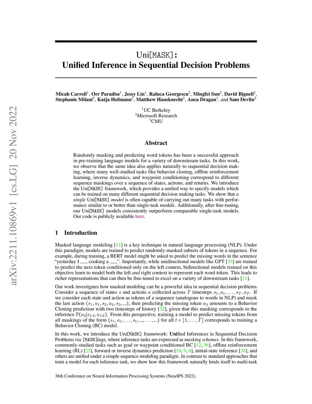 Randomly masking and predicting word tokens has been a successful approach in pre-training language models for a variety of downstream tasks. In this work, we observe that the same idea also applies naturally to sequential decision-making, where many well-studied tasks like behavior cloning, offline reinforcement learning, inverse dynamics, and waypoint conditioning correspond to different sequence maskings over a sequence of states, actions, and returns. We introduce the UniMASK framework, which provides a unified way to specify models which can be trained on many different sequential decision-making tasks. We show that a single UniMASK model is often capable of carrying out many tasks with performance similar to or better than single-task models. Additionally, after fine-tuning, our UniMASK models consistently outperform comparable single-task models. Our code is publicly available at https://github.com/micahcarroll/uniMASK.