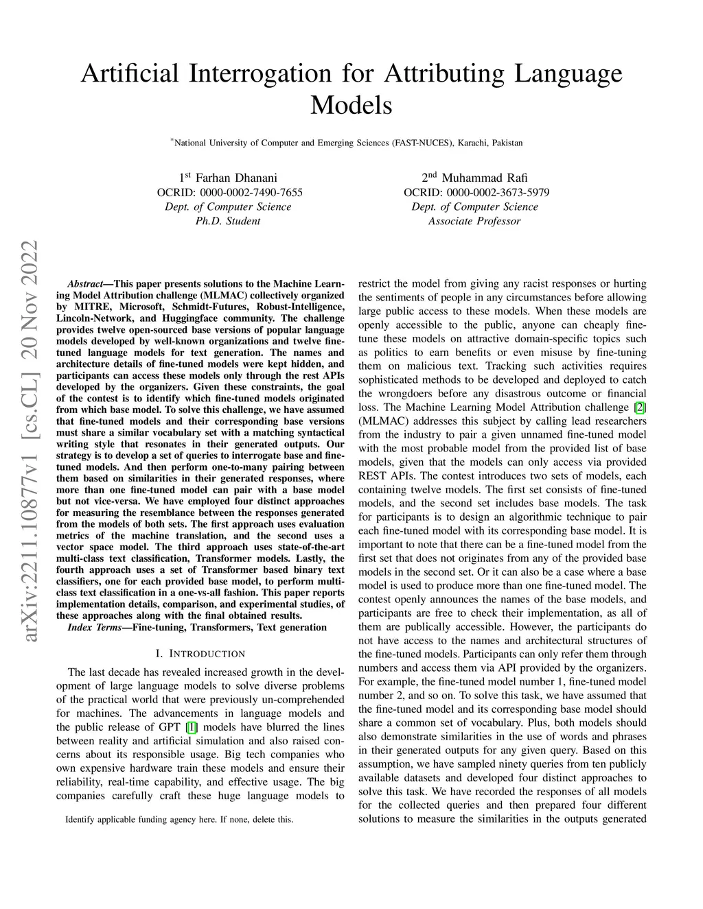 This paper presents solutions to the Machine Learning Model Attribution challenge (MLMAC) collectively organized by MITRE, Microsoft, Schmidt-Futures, Robust-Intelligence, Lincoln-Network, and Huggingface community. The challenge provides twelve open-sourced base versions of popular language models developed by well-known organizations and twelve fine-tuned language models for text generation. The names and architecture details of fine-tuned models were kept hidden, and participants can access these models only through the rest APIs developed by the organizers. Given these constraints, the goal of the contest is to identify which fine-tuned models originated from which base model. To solve this challenge, we have assumed that fine-tuned models and their corresponding base versions must share a similar vocabulary set with a matching syntactical writing style that resonates in their generated outputs. Our strategy is to develop a set of queries to interrogate base and fine-tuned models. And then perform one-to-many pairing between them based on similarities in their generated responses, where more than one fine-tuned model can pair with a base model but not vice-versa. We have employed four distinct approaches for measuring the resemblance between the responses generated from the models of both sets. The first approach uses evaluation metrics of the machine translation, and the second uses a vector space model. The third approach uses state-of-the-art multi-class text classification, Transformer models. Lastly, the fourth approach uses a set of Transformer based binary text classifiers, one for each provided base model, to perform multi-class text classification in a one-vs-all fashion. This paper reports implementation details, comparison, and experimental studies, of these approaches along with the final obtained results.