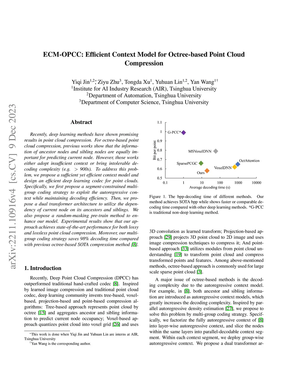 Recently, deep learning methods have shown promising results in point cloud compression. For octree-based point cloud compression, previous works show that the information of ancestor nodes and sibling nodes are equally important for predicting current node. However, those works either adopt insufficient context or bring intolerable decoding complexity (e.g. >600s). To address this problem, we propose a sufficient yet efficient context model and design an efficient deep learning codec for point clouds. Specifically, we first propose a window-constrained multi-group coding strategy to exploit the autoregressive context while maintaining decoding efficiency. Then, we propose a dual transformer architecture to utilize the dependency of current node on its ancestors and siblings. We also propose a random-masking pre-train method to enhance our model. Experimental results show that our approach achieves state-of-the-art performance for both lossy and lossless point cloud compression. Moreover, our multi-group coding strategy saves 98% decoding time compared with previous octree-based compression method.