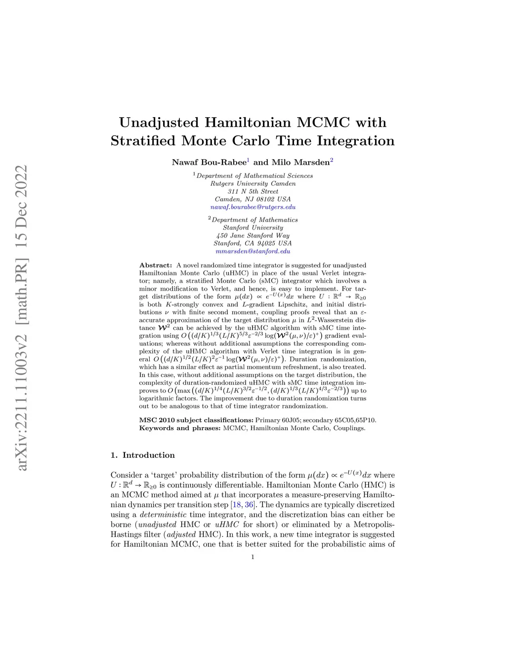 A novel randomized time integrator is suggested for unadjusted Hamiltonian Monte Carlo (uHMC) in place of the usual Verlet integrator; namely, a stratified Monte Carlo (sMC) integrator which involves a minor modification to Verlet, and hence, is easy to implement. For target distributions of the form where is both -strongly convex and -gradient Lipschitz, and initial distributions with finite second moment, coupling proofs reveal that an -accurate approximation of the target distribution in -Wasserstein distance can be achieved by the uHMC algorithm with sMC time integration using gradient evaluations; whereas without additional assumptions the corresponding complexity of the uHMC algorithm with Verlet time integration is in general . Duration randomization, which has a similar effect as partial momentum refreshment, is also treated. In this case, without additional assumptions on the target distribution, the complexity of duration-randomized uHMC with sMC time integration improves to up to logarithmic factors. The improvement due to duration randomization turns out to be analogous to that of time integrator randomization.