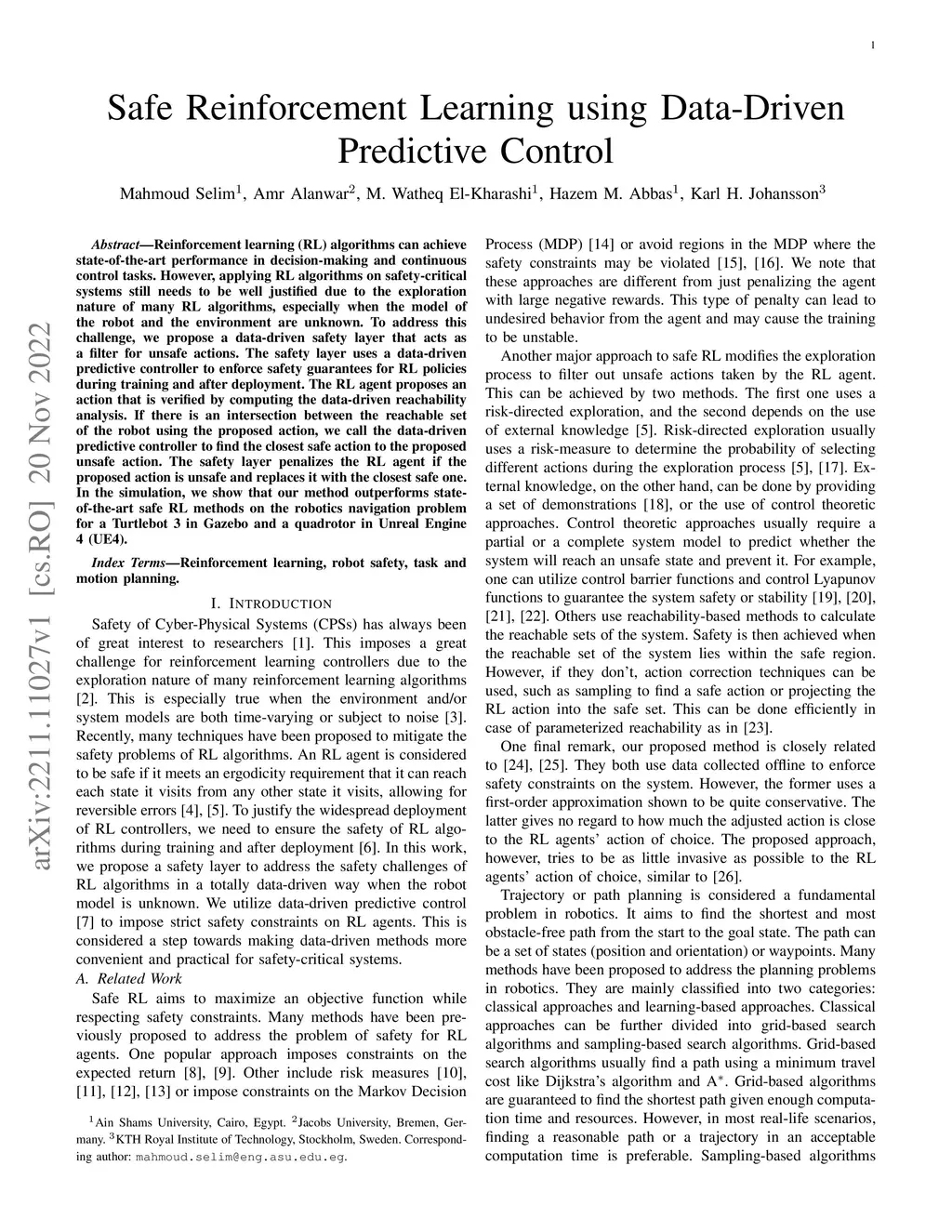 Reinforcement learning (RL) algorithms can achieve state-of-the-art performance in decision-making and continuous control tasks. However, applying RL algorithms on safety-critical systems still needs to be well justified due to the exploration nature of many RL algorithms, especially when the model of the robot and the environment are unknown. To address this challenge, we propose a data-driven safety layer that acts as a filter for unsafe actions. The safety layer uses a data-driven predictive controller to enforce safety guarantees for RL policies during training and after deployment. The RL agent proposes an action that is verified by computing the data-driven reachability analysis. If there is an intersection between the reachable set of the robot using the proposed action, we call the data-driven predictive controller to find the closest safe action to the proposed unsafe action. The safety layer penalizes the RL agent if the proposed action is unsafe and replaces it with the closest safe one. In the simulation, we show that our method outperforms state-of-the-art safe RL methods on the robotics navigation problem for a Turtlebot 3 in Gazebo and a quadrotor in Unreal Engine 4 (UE4).