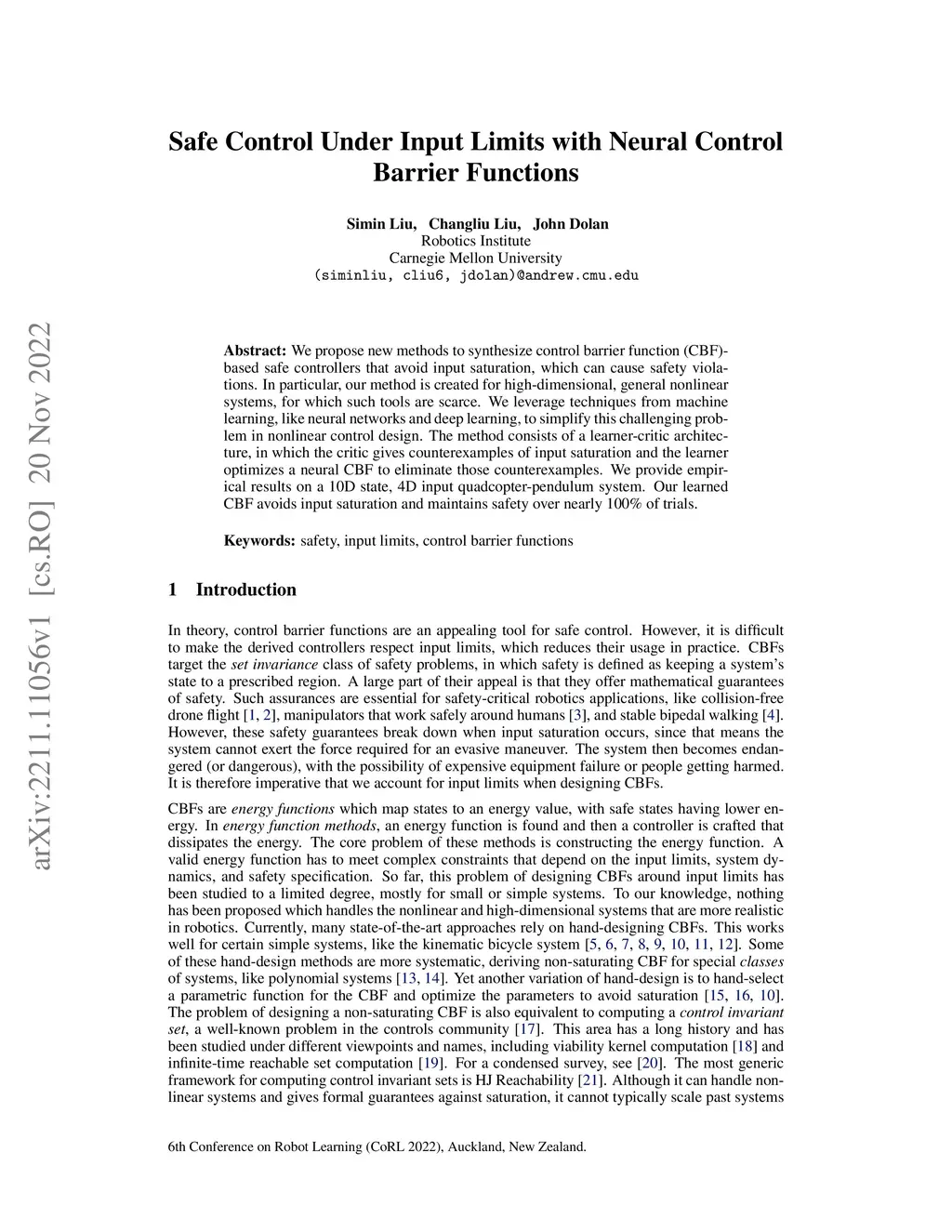 We propose new methods to synthesize control barrier function (CBF)-based safe controllers that avoid input saturation, which can cause safety violations. In particular, our method is created for high-dimensional, general nonlinear systems, for which such tools are scarce. We leverage techniques from machine learning, like neural networks and deep learning, to simplify this challenging problem in nonlinear control design. The method consists of a learner-critic architecture, in which the critic gives counterexamples of input saturation and the learner optimizes a neural CBF to eliminate those counterexamples. We provide empirical results on a 10D state, 4D input quadcopter-pendulum system. Our learned CBF avoids input saturation and maintains safety over nearly 100% of trials.