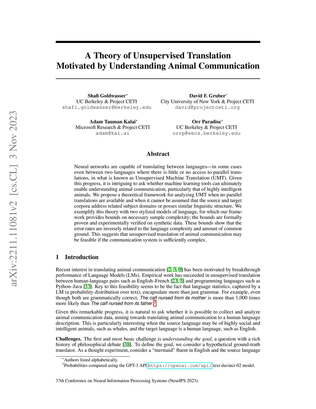 Neural networks are capable of translating between languages -- in some cases even between two languages where there is little or no access to parallel translations, in what is known as Unsupervised Machine Translation (UMT). Given this progress, it is intriguing to ask whether machine learning tools can ultimately enable understanding animal communication, particularly that of highly intelligent animals. We propose a theoretical framework for analyzing UMT when no parallel translations are available and when it cannot be assumed that the source and target corpora address related subject domains or posses similar linguistic structure. We exemplify this theory with two stylized models of language, for which our framework provides bounds on necessary sample complexity; the bounds are formally proven and experimentally verified on synthetic data. These bounds show that the error rates are inversely related to the language complexity and amount of common ground. This suggests that unsupervised translation of animal communication may be feasible if the communication system is sufficiently complex.