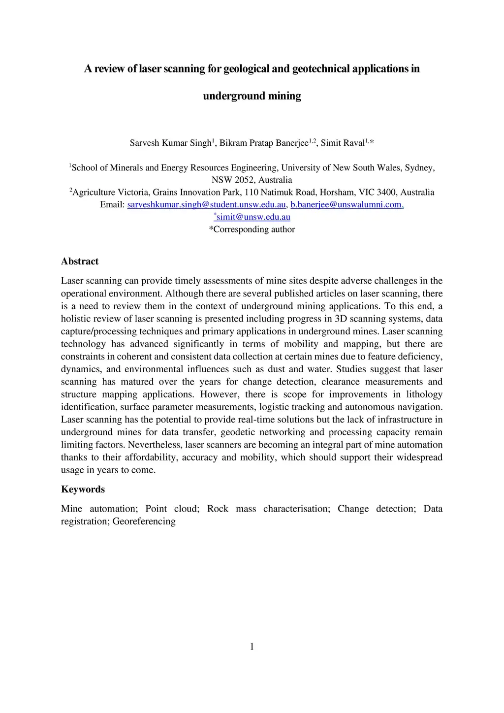 Laser scanning can provide timely assessments of mine sites despite adverse challenges in the operational environment. Although there are several published articles on laser scanning, there is a need to review them in the context of underground mining applications. To this end, a holistic review of laser scanning is presented including progress in 3D scanning systems, data capture/processing techniques and primary applications in underground mines. Laser scanning technology has advanced significantly in terms of mobility and mapping, but there are constraints in coherent and consistent data collection at certain mines due to feature deficiency, dynamics, and environmental influences such as dust and water. Studies suggest that laser scanning has matured over the years for change detection, clearance measurements and structure mapping applications. However, there is scope for improvements in lithology identification, surface parameter measurements, logistic tracking and autonomous navigation. Laser scanning has the potential to provide real-time solutions but the lack of infrastructure in underground mines for data transfer, geodetic networking and processing capacity remain limiting factors. Nevertheless, laser scanners are becoming an integral part of mine automation thanks to their affordability, accuracy and mobility, which should support their widespread usage in years to come.