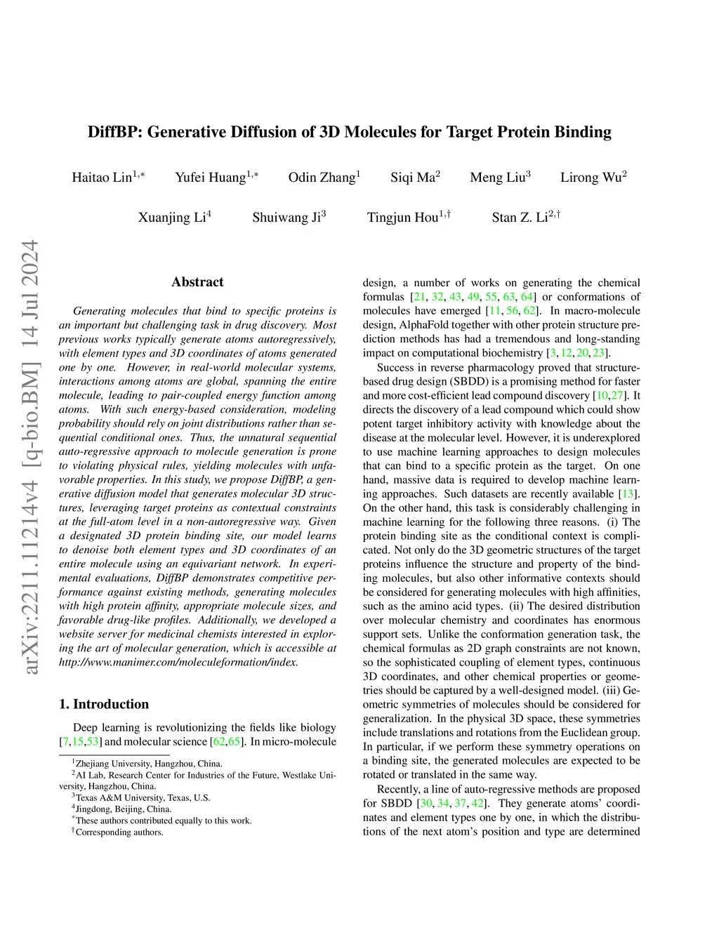 DiffBP: Generative Diffusion of 3D Molecules for Target Protein Binding