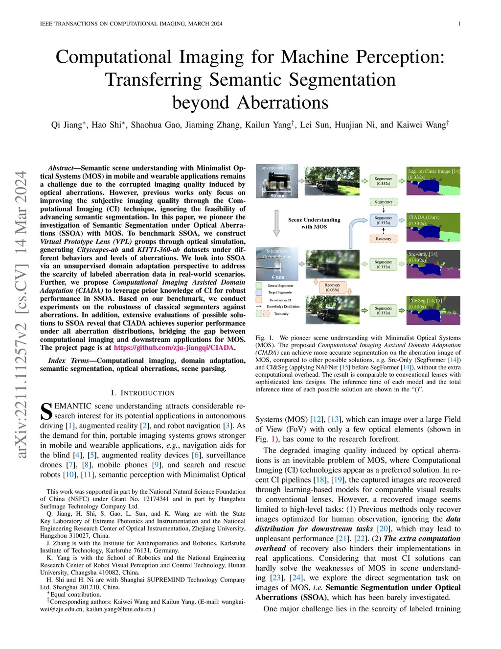 Semantic scene understanding with Minimalist Optical Systems (MOS) in mobile and wearable applications remains a challenge due to the corrupted imaging quality induced by optical aberrations. However, previous works only focus on improving the subjective imaging quality through the Computational Imaging (CI) technique, ignoring the feasibility of advancing semantic segmentation. In this paper, we pioneer the investigation of Semantic Segmentation under Optical Aberrations (SSOA) with MOS. To benchmark SSOA, we construct Virtual Prototype Lens (VPL) groups through optical simulation, generating Cityscapes-ab and KITTI-360-ab datasets under different behaviors and levels of aberrations. We look into SSOA via an unsupervised domain adaptation perspective to address the scarcity of labeled aberration data in real-world scenarios. Further, we propose Computational Imaging Assisted Domain Adaptation (CIADA) to leverage prior knowledge of CI for robust performance in SSOA. Based on our benchmark, we conduct experiments on the robustness of classical segmenters against aberrations. In addition, extensive evaluations of possible solutions to SSOA reveal that CIADA achieves superior performance under all aberration distributions, bridging the gap between computational imaging and downstream applications for MOS. The project page is at https://github.com/zju-jiangqi/CIADA.