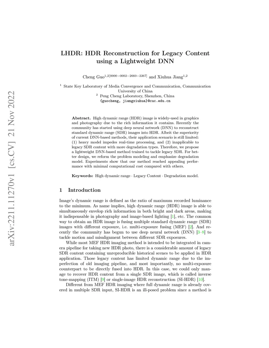 High dynamic range (HDR) image is widely-used in graphics and photography due to the rich information it contains. Recently the community has started using deep neural network (DNN) to reconstruct standard dynamic range (SDR) images into HDR. Albeit the superiority of current DNN-based methods, their application scenario is still limited: (1) heavy model impedes real-time processing, and (2) inapplicable to legacy SDR content with more degradation types. Therefore, we propose a lightweight DNN-based method trained to tackle legacy SDR. For better design, we reform the problem modeling and emphasize degradation model. Experiments show that our method reached appealing performance with minimal computational cost compared with others.