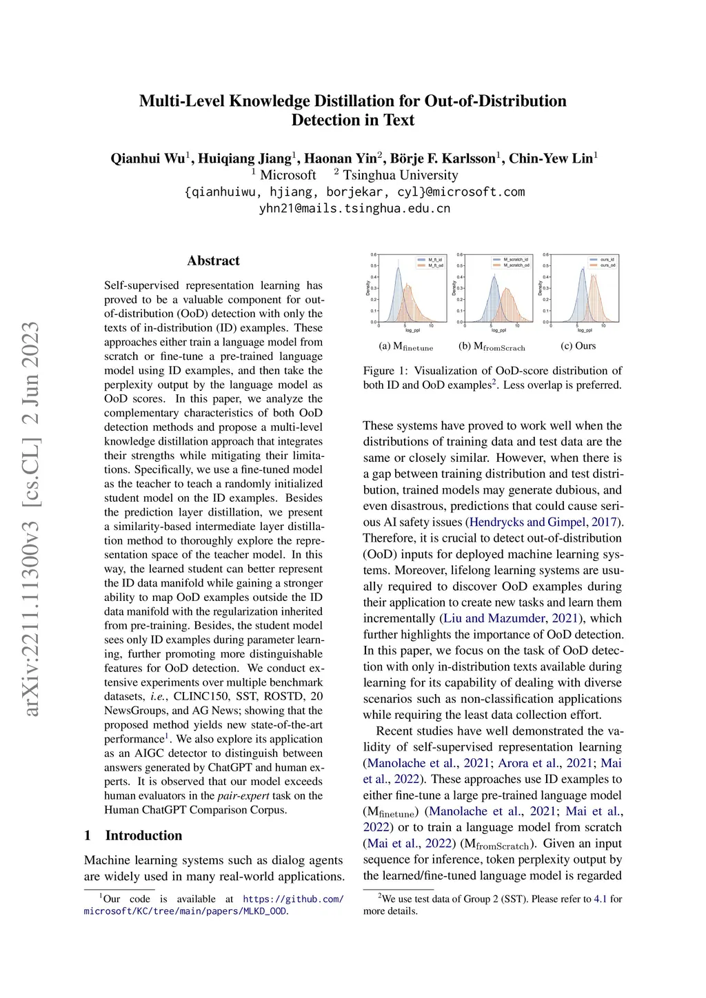 Self-supervised representation learning has proved to be a valuable component for out-of-distribution (OoD) detection with only the texts of in-distribution (ID) examples. These approaches either train a language model from scratch or fine-tune a pre-trained language model using ID examples, and then take the perplexity output by the language model as OoD scores. In this paper, we analyze the complementary characteristics of both OoD detection methods and propose a multi-level knowledge distillation approach that integrates their strengths while mitigating their limitations. Specifically, we use a fine-tuned model as the teacher to teach a randomly initialized student model on the ID examples. Besides the prediction layer distillation, we present a similarity-based intermediate layer distillation method to thoroughly explore the representation space of the teacher model. In this way, the learned student can better represent the ID data manifold while gaining a stronger ability to map OoD examples outside the ID data manifold with the regularization inherited from pre-training. Besides, the student model sees only ID examples during parameter learning, further promoting more distinguishable features for OoD detection. We conduct extensive experiments over multiple benchmark datasets, i.e., CLINC150, SST, ROSTD, 20 NewsGroups, and AG News; showing that the proposed method yields new state-of-the-art performance. We also explore its application as an AIGC detector to distinguish between answers generated by ChatGPT and human experts. It is observed that our model exceeds human evaluators in the pair-expert task on the Human ChatGPT Comparison Corpus.
