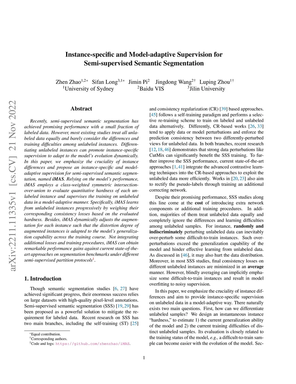 Recently, semi-supervised semantic segmentation has achieved promising performance with a small fraction of labeled data. However, most existing studies treat all unlabeled data equally and barely consider the differences and training difficulties among unlabeled instances. Differentiating unlabeled instances can promote instance-specific supervision to adapt to the model's evolution dynamically. In this paper, we emphasize the cruciality of instance differences and propose an instance-specific and model-adaptive supervision for semi-supervised semantic segmentation, named iMAS. Relying on the model's performance, iMAS employs a class-weighted symmetric intersection-over-union to evaluate quantitative hardness of each unlabeled instance and supervises the training on unlabeled data in a model-adaptive manner. Specifically, iMAS learns from unlabeled instances progressively by weighing their corresponding consistency losses based on the evaluated hardness. Besides, iMAS dynamically adjusts the augmentation for each instance such that the distortion degree of augmented instances is adapted to the model's generalization capability across the training course. Not integrating additional losses and training procedures, iMAS can obtain remarkable performance gains against current state-of-the-art approaches on segmentation benchmarks under different semi-supervised partition protocols.