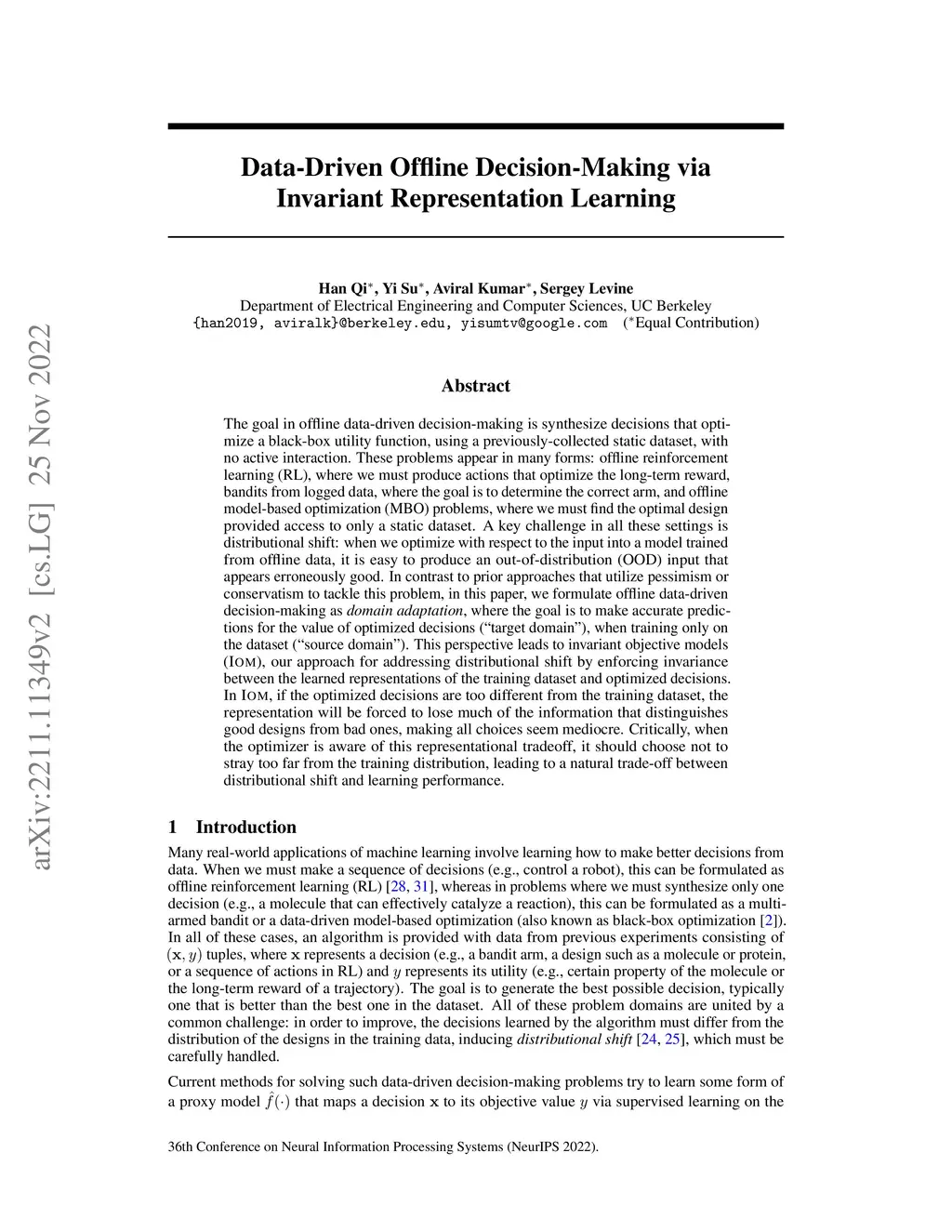 The goal in offline data-driven decision-making is synthesize decisions that optimize a black-box utility function, using a previously-collected static dataset, with no active interaction. These problems appear in many forms: offline reinforcement learning (RL), where we must produce actions that optimize the long-term reward, bandits from logged data, where the goal is to determine the correct arm, and offline model-based optimization (MBO) problems, where we must find the optimal design provided access to only a static dataset. A key challenge in all these settings is distributional shift: when we optimize with respect to the input into a model trained from offline data, it is easy to produce an out-of-distribution (OOD) input that appears erroneously good. In contrast to prior approaches that utilize pessimism or conservatism to tackle this problem, in this paper, we formulate offline data-driven decision-making as domain adaptation, where the goal is to make accurate predictions for the value of optimized decisions ("target domain"), when training only on the dataset ("source domain"). This perspective leads to invariant objective models (IOM), our approach for addressing distributional shift by enforcing invariance between the learned representations of the training dataset and optimized decisions. In IOM, if the optimized decisions are too different from the training dataset, the representation will be forced to lose much of the information that distinguishes good designs from bad ones, making all choices seem mediocre. Critically, when the optimizer is aware of this representational tradeoff, it should choose not to stray too far from the training distribution, leading to a natural trade-off between distributional shift and learning performance.
