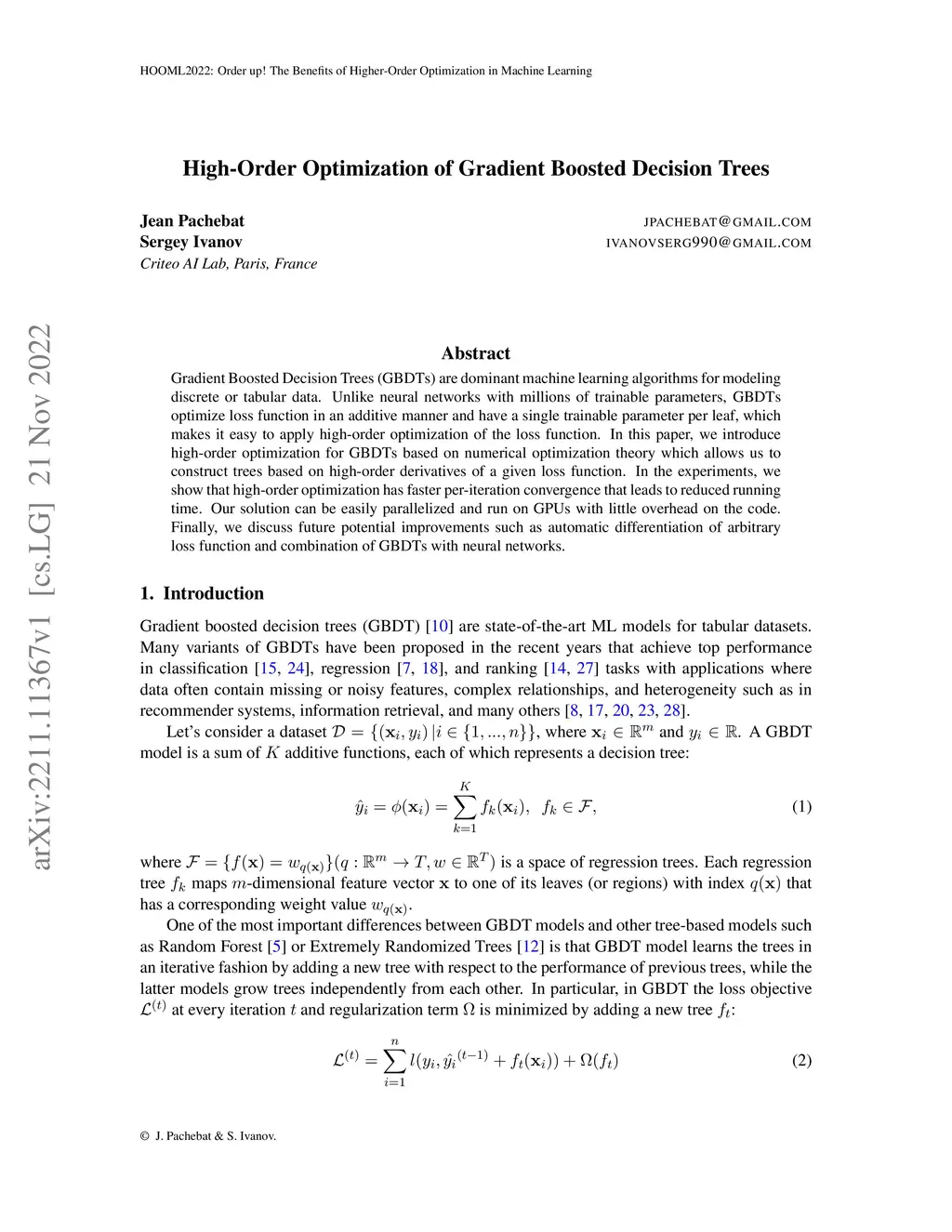 Gradient Boosted Decision Trees (GBDTs) are dominant machine learning algorithms for modeling discrete or tabular data. Unlike neural networks with millions of trainable parameters, GBDTs optimize loss function in an additive manner and have a single trainable parameter per leaf, which makes it easy to apply high-order optimization of the loss function. In this paper, we introduce high-order optimization for GBDTs based on numerical optimization theory which allows us to construct trees based on high-order derivatives of a given loss function. In the experiments, we show that high-order optimization has faster per-iteration convergence that leads to reduced running time. Our solution can be easily parallelized and run on GPUs with little overhead on the code. Finally, we discuss future potential improvements such as automatic differentiation of arbitrary loss function and combination of GBDTs with neural networks.