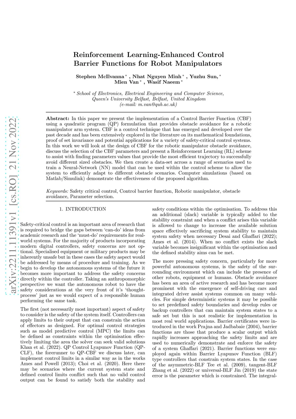 In this paper we present the implementation of a Control Barrier Function (CBF) using a quadratic program (QP) formulation that provides obstacle avoidance for a robotic manipulator arm system. CBF is a control technique that has emerged and developed over the past decade and has been extensively explored in the literature on its mathematical foundations, proof of set invariance and potential applications for a variety of safety-critical control systems. In this work we will look at the design of CBF for the robotic manipulator obstacle avoidance, discuss the selection of the CBF parameters and present a Reinforcement Learning (RL) scheme to assist with finding parameters values that provide the most efficient trajectory to successfully avoid different sized obstacles. We then create a data-set across a range of scenarios used to train a Neural-Network (NN) model that can be used within the control scheme to allow the system to efficiently adapt to different obstacle scenarios. Computer simulations (based on Matlab/Simulink) demonstrate the effectiveness of the proposed algorithm.