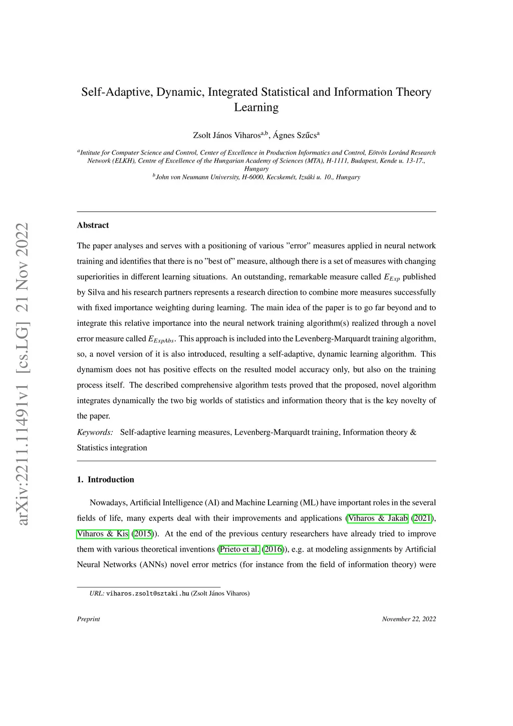 The paper analyses and serves with a positioning of various error measures applied in neural network training and identifies that there is no best of measure, although there is a set of measures with changing superiorities in different learning situations. An outstanding, remarkable measure called published by Silva and his research partners represents a research direction to combine more measures successfully with fixed importance weighting during learning. The main idea of the paper is to go far beyond and to integrate this relative importance into the neural network training algorithm(s) realized through a novel error measure called . This approach is included into the Levenberg-Marquardt training algorithm, so, a novel version of it is also introduced, resulting a self-adaptive, dynamic learning algorithm. This dynamism does not has positive effects on the resulted model accuracy only, but also on the training process itself. The described comprehensive algorithm tests proved that the proposed, novel algorithm integrates dynamically the two big worlds of statistics and information theory that is the key novelty of the paper.